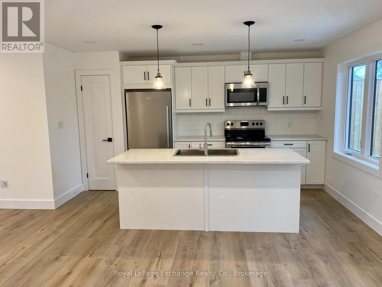 Introducing a brand new raised bungalow-style semi-detached residence thoughtfully designed to offer modern finishes, functional living space, and exceptional comfort. The open-concept main level features a contemporary kitchen seamlessly connected to the dining and living areas, creating an ideal setting for both everyday living and entertaining.The main floor is complete with a spacious primary bedroom and a full four-piece bathroom.The fully finished lower level offers two additional bedrooms, a generous recreation room, a second full bathroom, and a laundry/utility room - delivering versatile space suitable for families, guests, or home office needs. Patio doors off the dining area lead to a private deck, providing a quiet outdoor space perfect for relaxation or hosting guests. Additional features include stacked parking for each unit and brand new construction throughout. Available April 1, 2026.Tenant responsible for heat, hydro, and water. A beautifully designed home offering modern living in a practical and efficient layout - ideal for those seeking comfort, quality, and convenience. (Pictures from the other unit but are a mirror image)