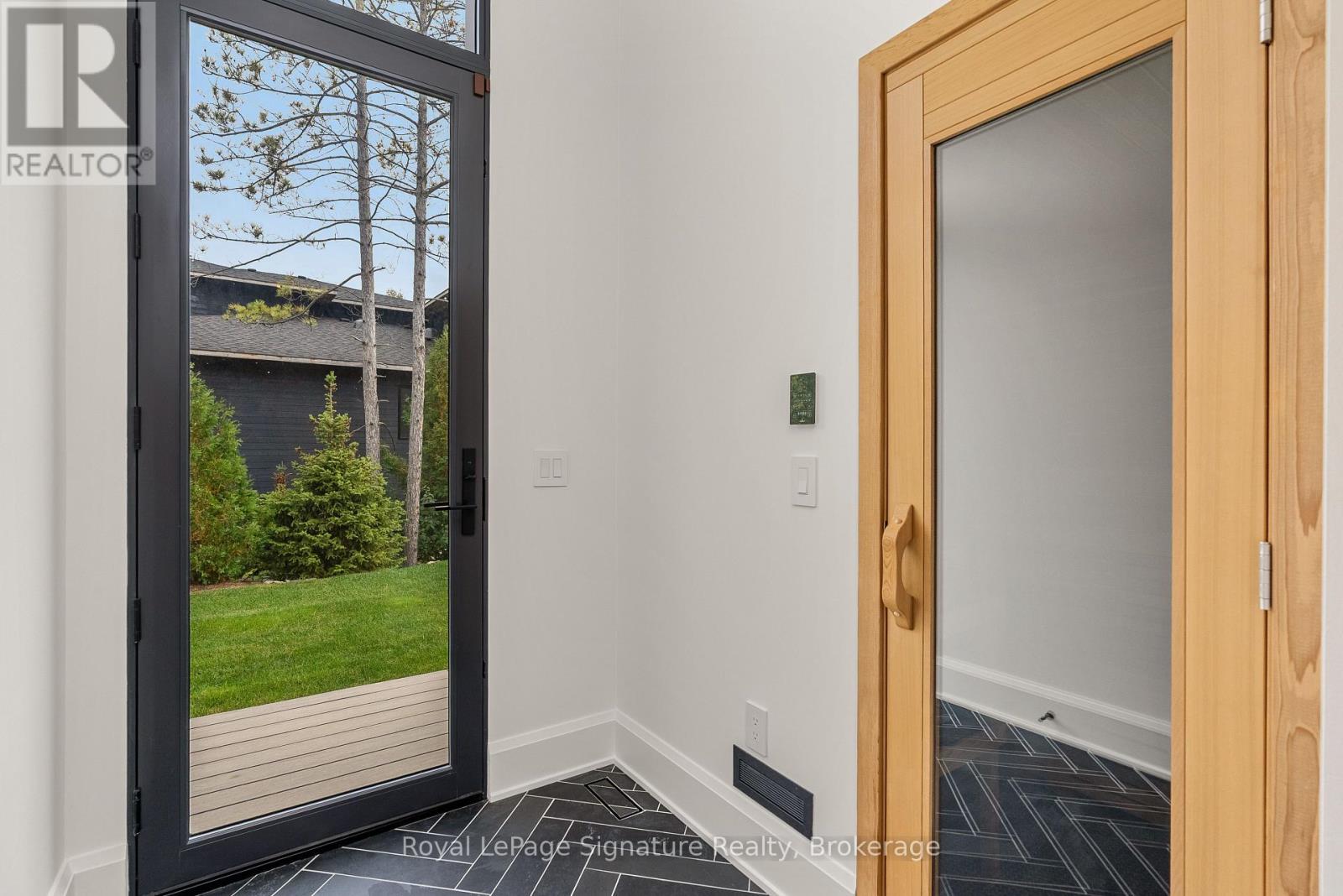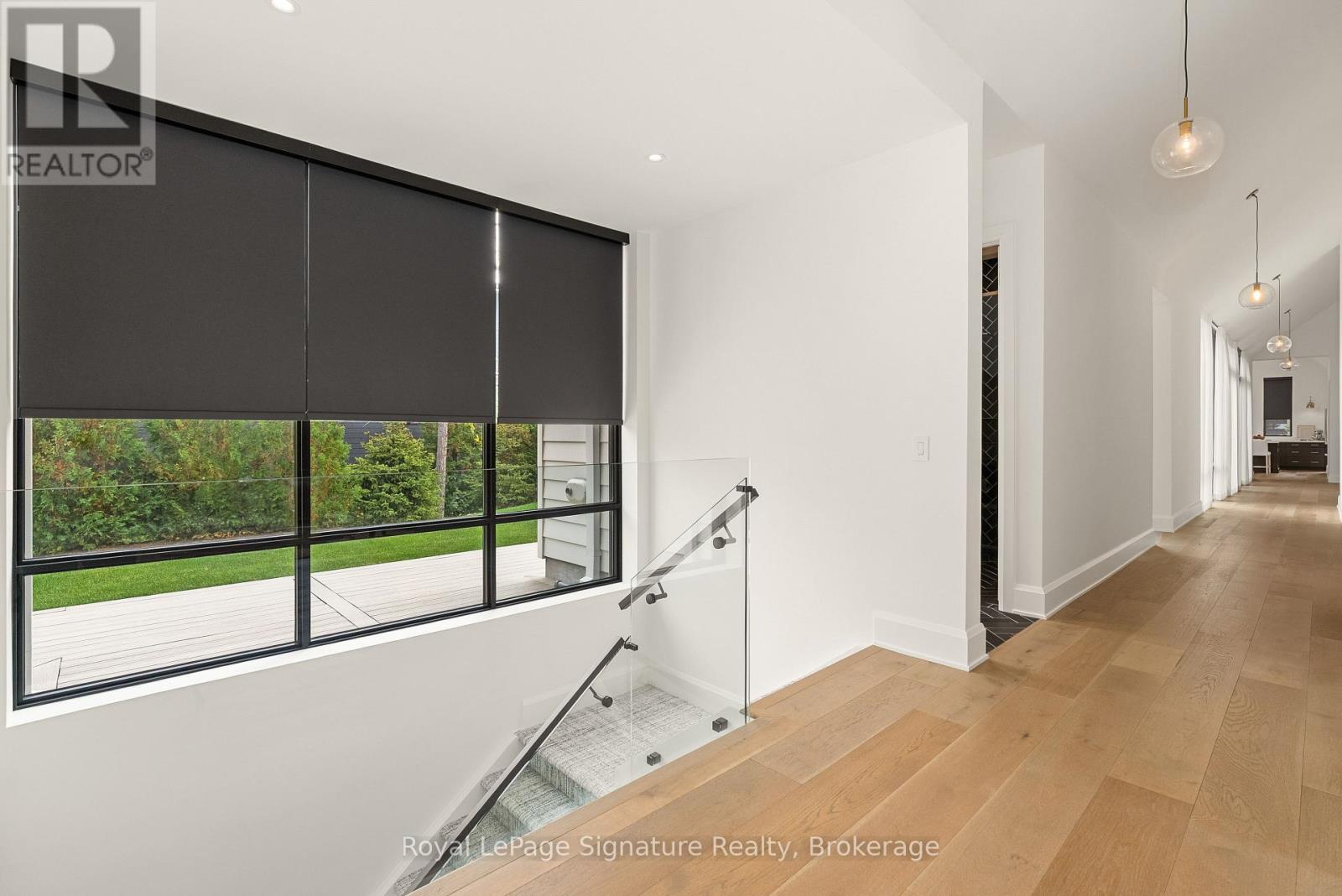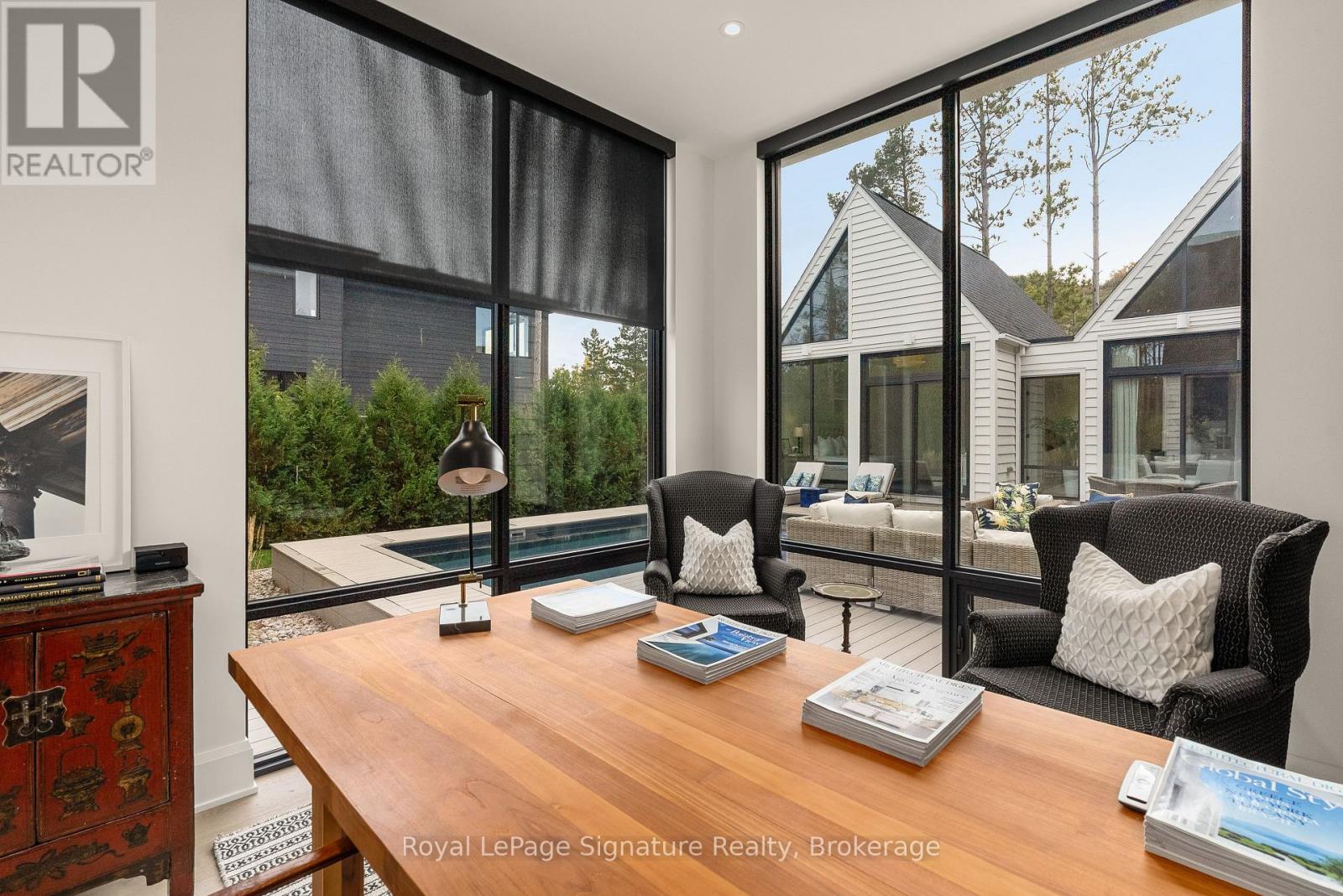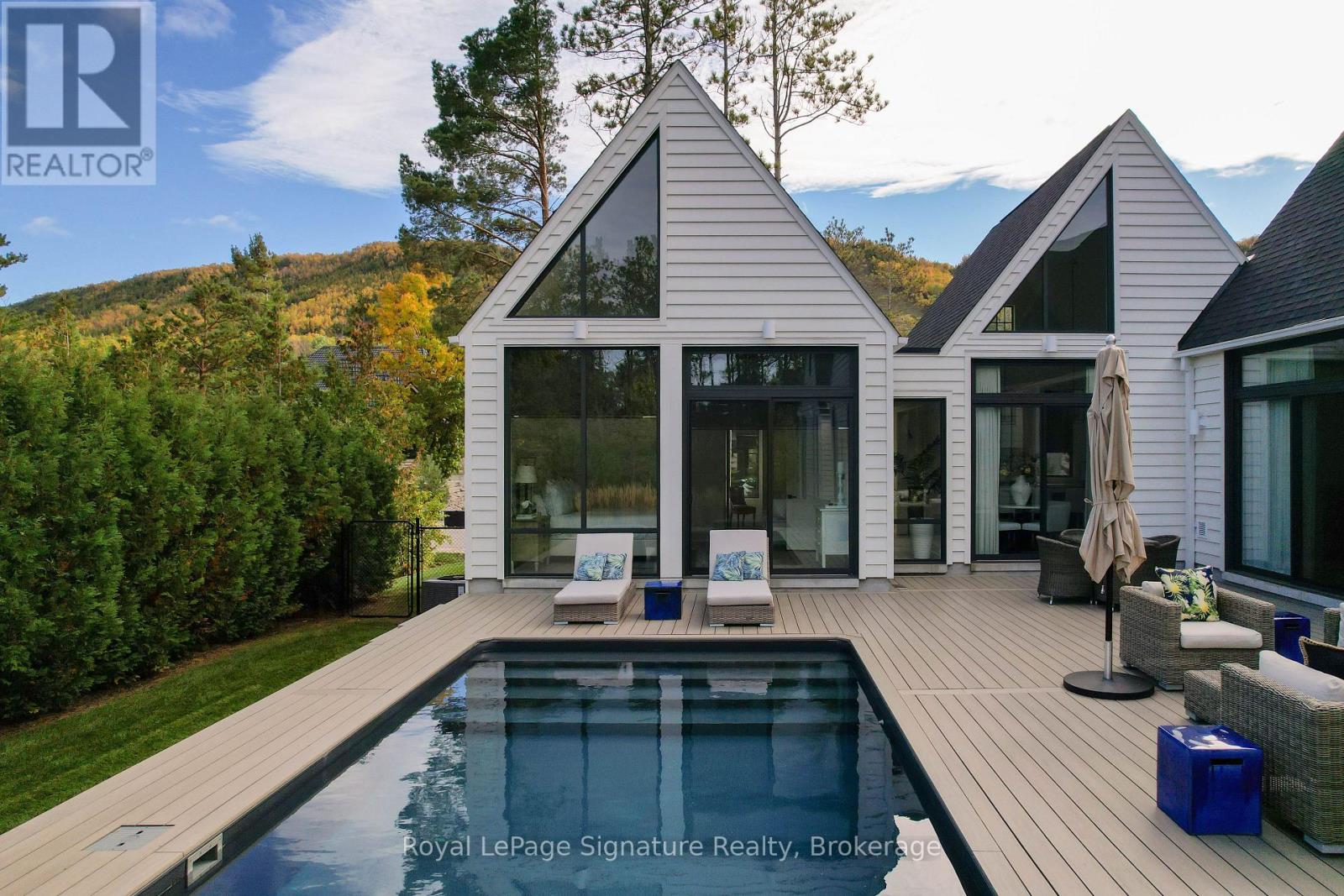 Nestled in the exclusive Peaks Bay community, this stunning modern bungalow offers over 5,000 square feet of finished living space, thoughtfully designed for comfort, style, and connection to nature. This custom-built home reflects craftsmanship and quality in every detail - from vaulted ceilings and Restoration Hardware fixtures to the warmth of wide-plank hardwood floors and a double-sided limestone fireplace that anchors the heart of the home.The open-concept kitchen, dining, and great room flow effortlessly onto an expansive 1,200-square-foot deck - perfect for entertaining after a day on the slopes or relaxing by the saltwater pool on a summer afternoon. The custom kitchen features Hanstone quartz surfaces, JennAir appliances, a walk-in pantry, and a servery with a wine fridge, making it ideal for gatherings with family and friends. The primary suite is a true sanctuary with a spa-like ensuite, his-and-hers showers, and a freestanding tub. Three additional bedrooms, an office with floor-to-ceiling windows, and a finished lower level with a gym and full bath provide space for everyone to unwind. Set on a beautifully landscaped lot between the mountains and the bay, this home captures the essence of the Blue Mountains lifestyle. Walk or bike to the crystal-clear shores of Georgian Bay, enjoy skiing at nearby Georgian Peaks, Alpine, Craigleith, and Blue Mountain resorts, or explore the area's hiking and cycling trails right from your door. Whether you're hosting apr\u00c3\u00a8s-ski evenings by the fire or quiet mornings with coffee on the deck, 101 Deer Lane is the perfect place to call home.