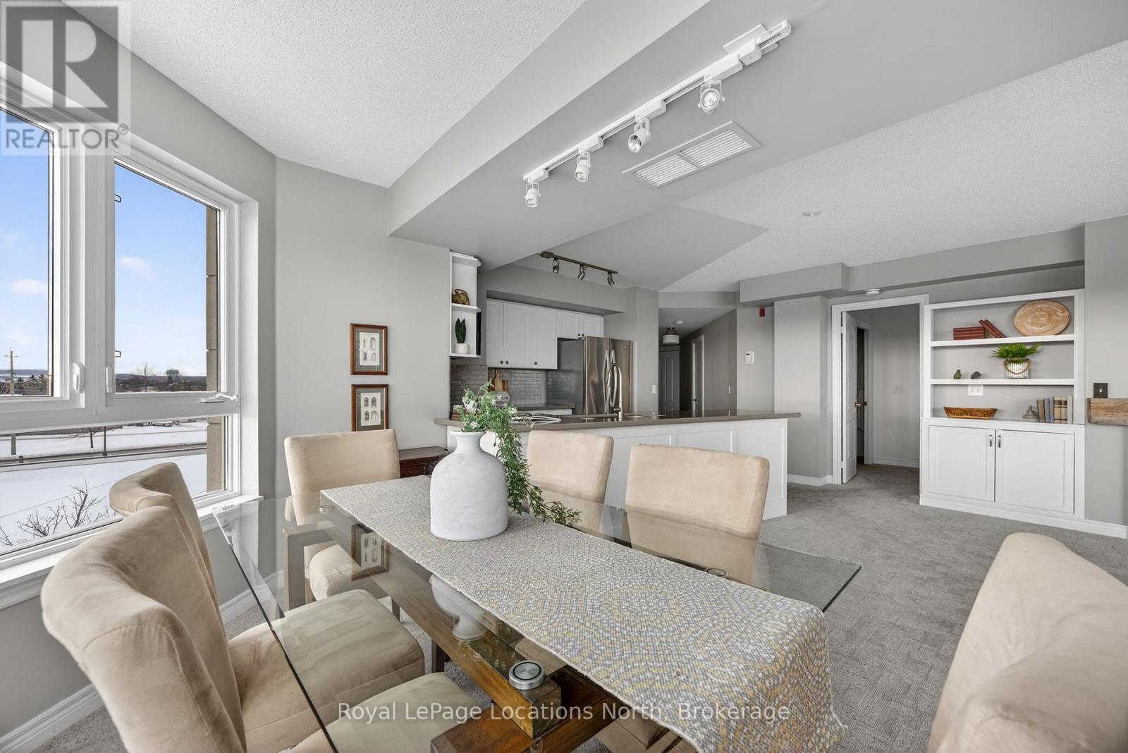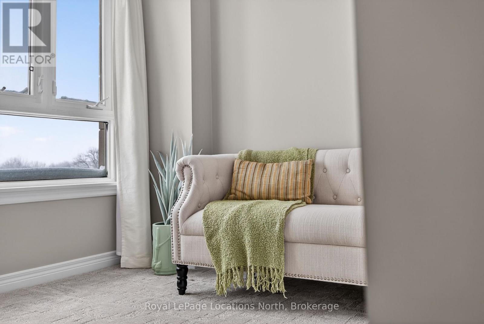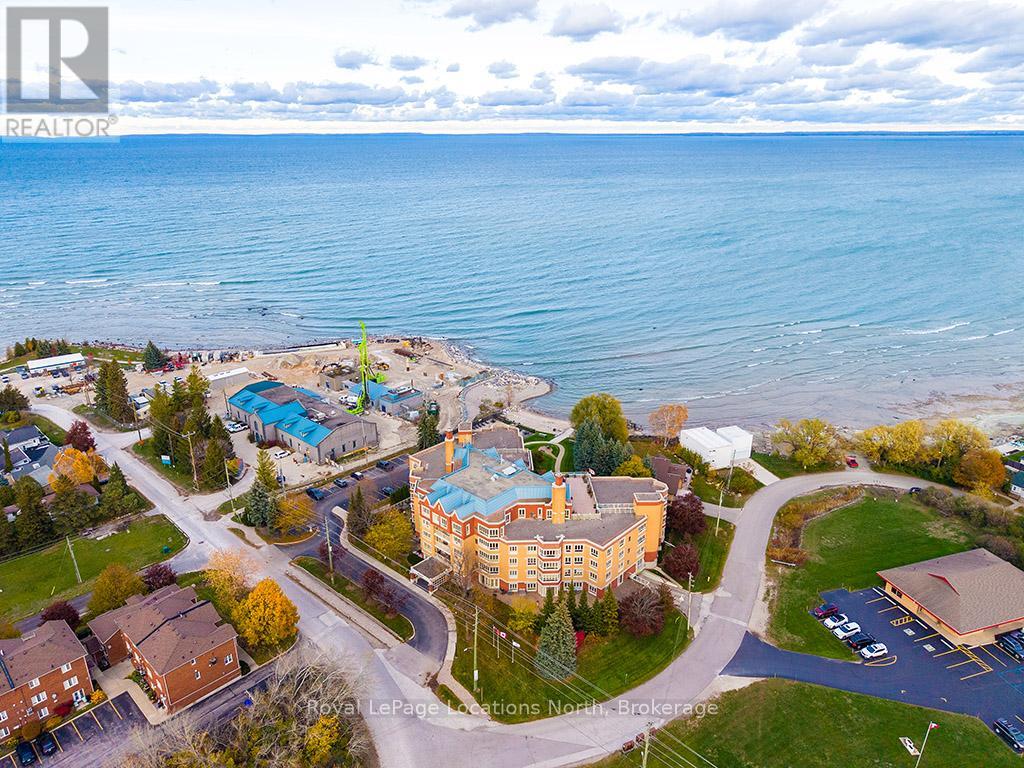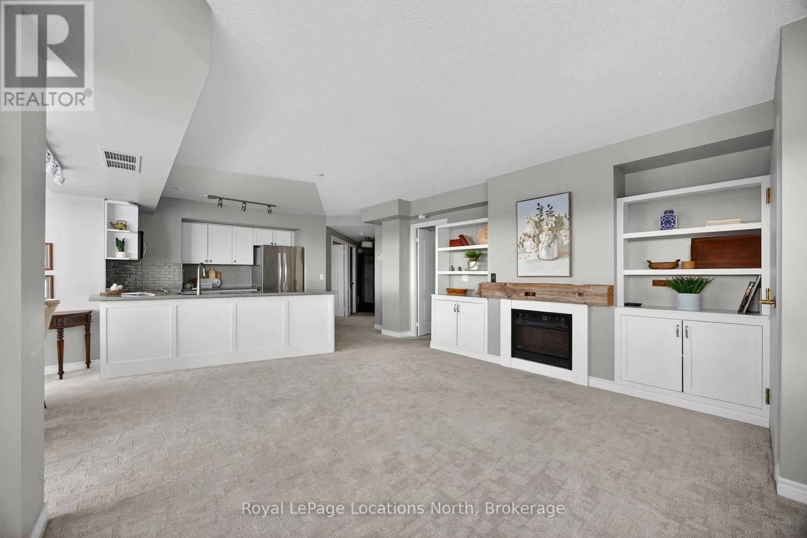 Collingwood's Exclusive Sunset Cove Waterfront Condo Community has a rare offering; an updated end unit with unobstructed PANORAMIC Georgian Bay Views! Located in a private, quiet corner of the 4th floor, this 1,289 sqft, 2 bedroom, 2 full bathroom condo is flooded with natural light all day long. The floorplan allows for layout options with a wide, oversized living space to include a dining + reading + lounging space. Enjoy cozy nights in front of the fireplace watching our local surfers conquer the Bay. The primary suite also has a water view + walk-in closet + 5pc ensuite and the spare bedroom converts easily to a den/sitting room with its beautiful Murphy Bed. Enjoy the upscale convenience and security of Sunset Cove, with heated underground parking, storage, library, patio/BBQ area, professionally maintained grounds & always friendly concierge service. The Gathering Room welcomes residents to enjoy the pool table, ping-pong, viewing parties & kitchen facilities. During warmer months, enjoy the salt water pool and private sandy beach on the shores of Georgian Bay. Sunset Cove is a short walk from all our historic downtown has to offer; restaurants, shopping, waterfront, parks & more. If you are looking for luxurious, effortless living with convenience, warmth and community, book your private viewing today.