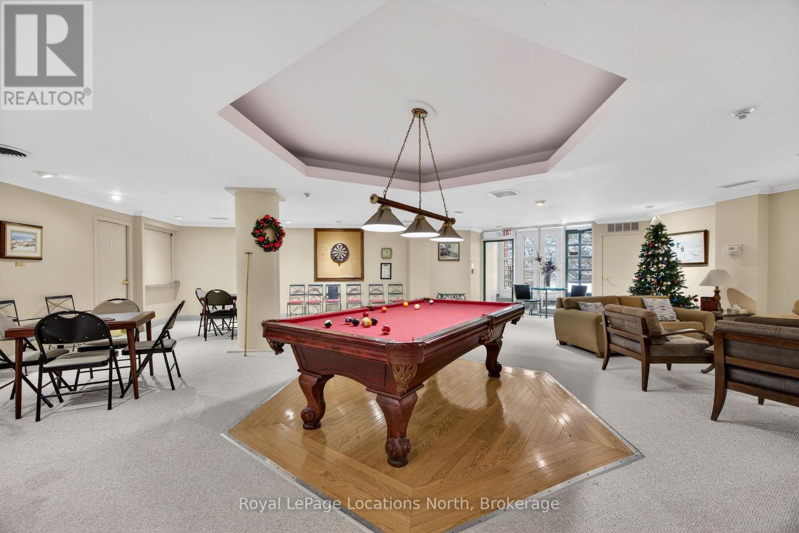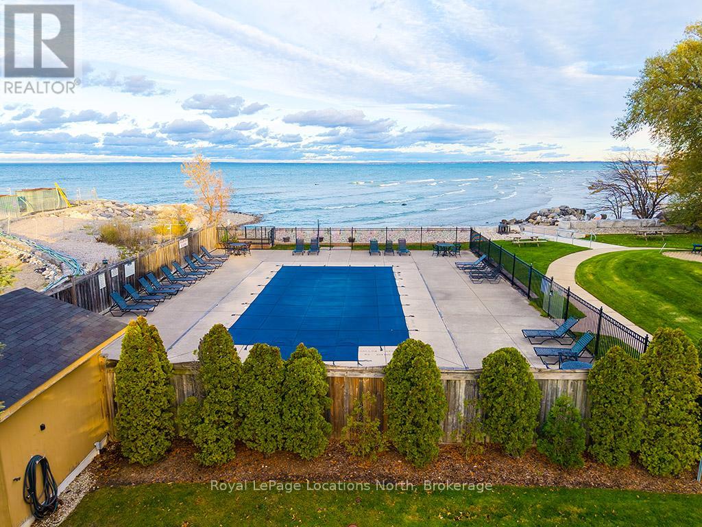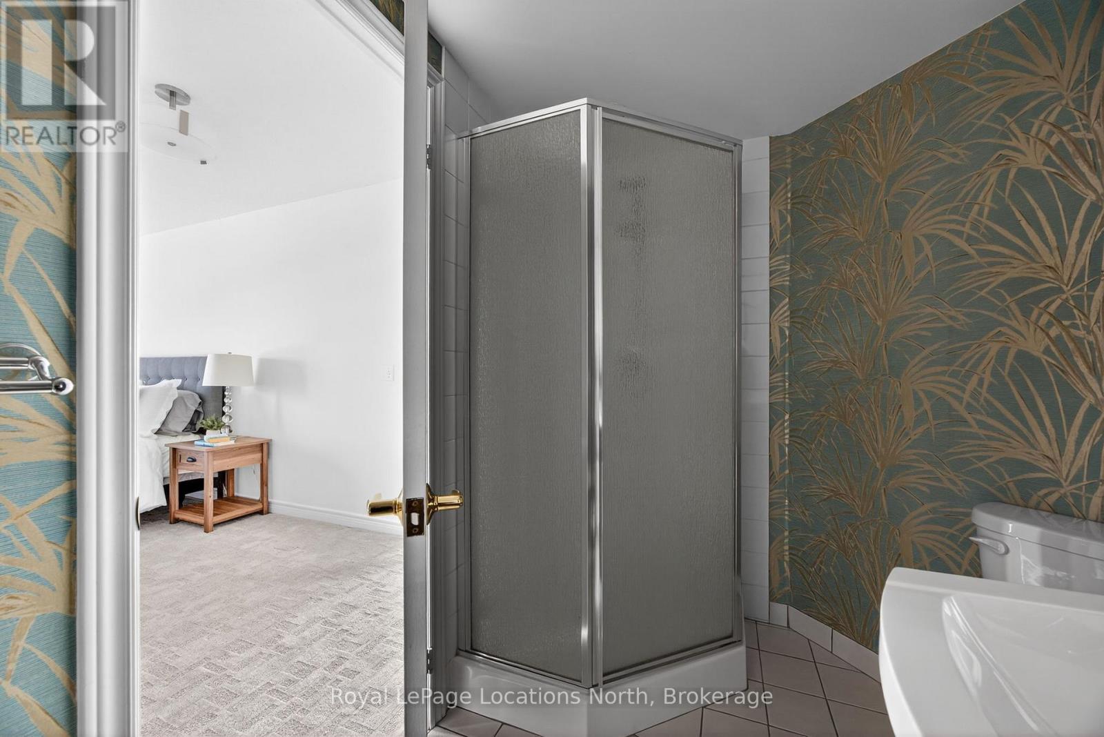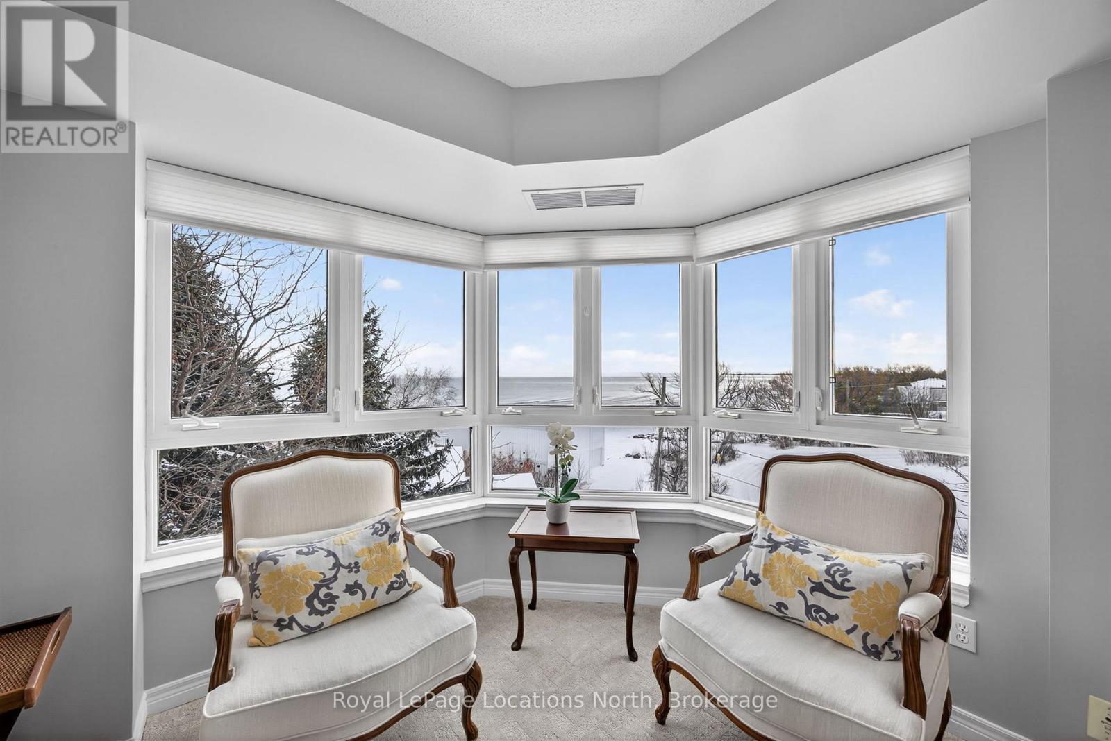 Collingwood's Exclusive Sunset Cove Waterfront Condo Community has a rare offering; an updated end unit with unobstructed PANORAMIC Georgian Bay Views! Located in a private, quiet corner of the 4th floor, this 1,289 sqft, 2 bedroom, 2 full bathroom condo is flooded with natural light all day long. The floorplan allows for layout options with a wide, oversized living space to include a dining + reading + lounging space. Enjoy cozy nights in front of the fireplace watching our local surfers conquer the Bay. The primary suite also has a water view + walk-in closet + 5pc ensuite and the spare bedroom converts easily to a den/sitting room with its beautiful Murphy Bed. Enjoy the upscale convenience and security of Sunset Cove, with heated underground parking, storage, library, patio/BBQ area, professionally maintained grounds & always friendly concierge service. The Gathering Room welcomes residents to enjoy the pool table, ping-pong, viewing parties & kitchen facilities. During warmer months, enjoy the salt water pool and private sandy beach on the shores of Georgian Bay. Sunset Cove is a short walk from all our historic downtown has to offer; restaurants, shopping, waterfront, parks & more. If you are looking for luxurious, effortless living with convenience, warmth and community, book your private viewing today.