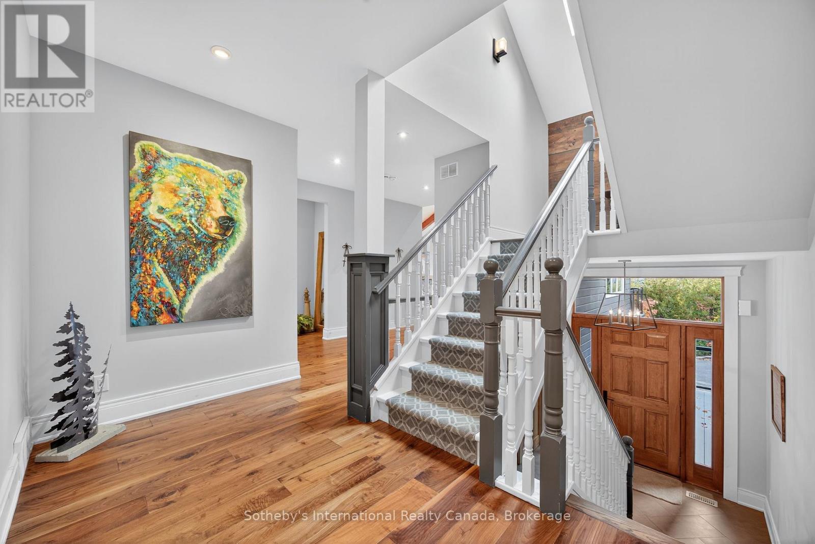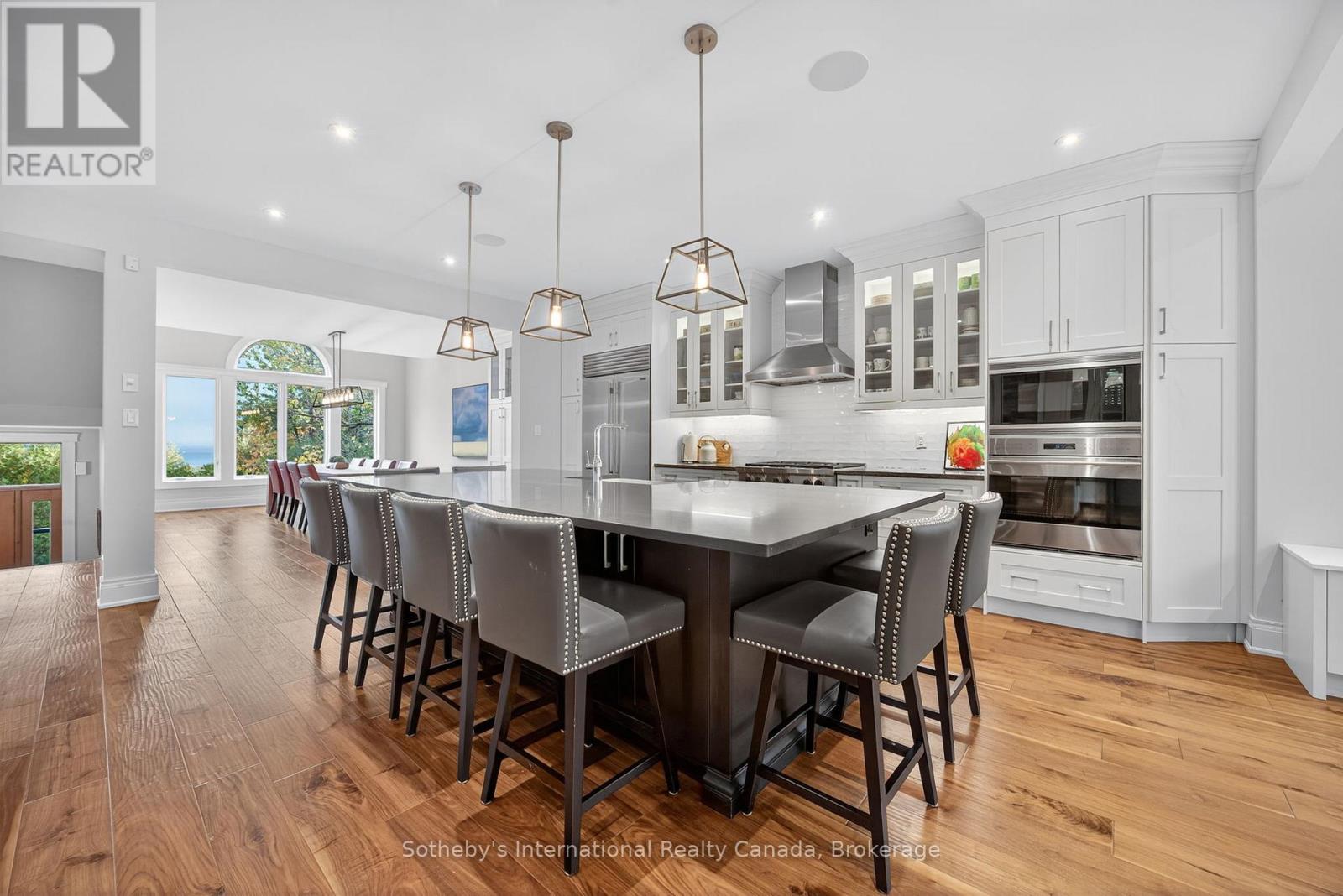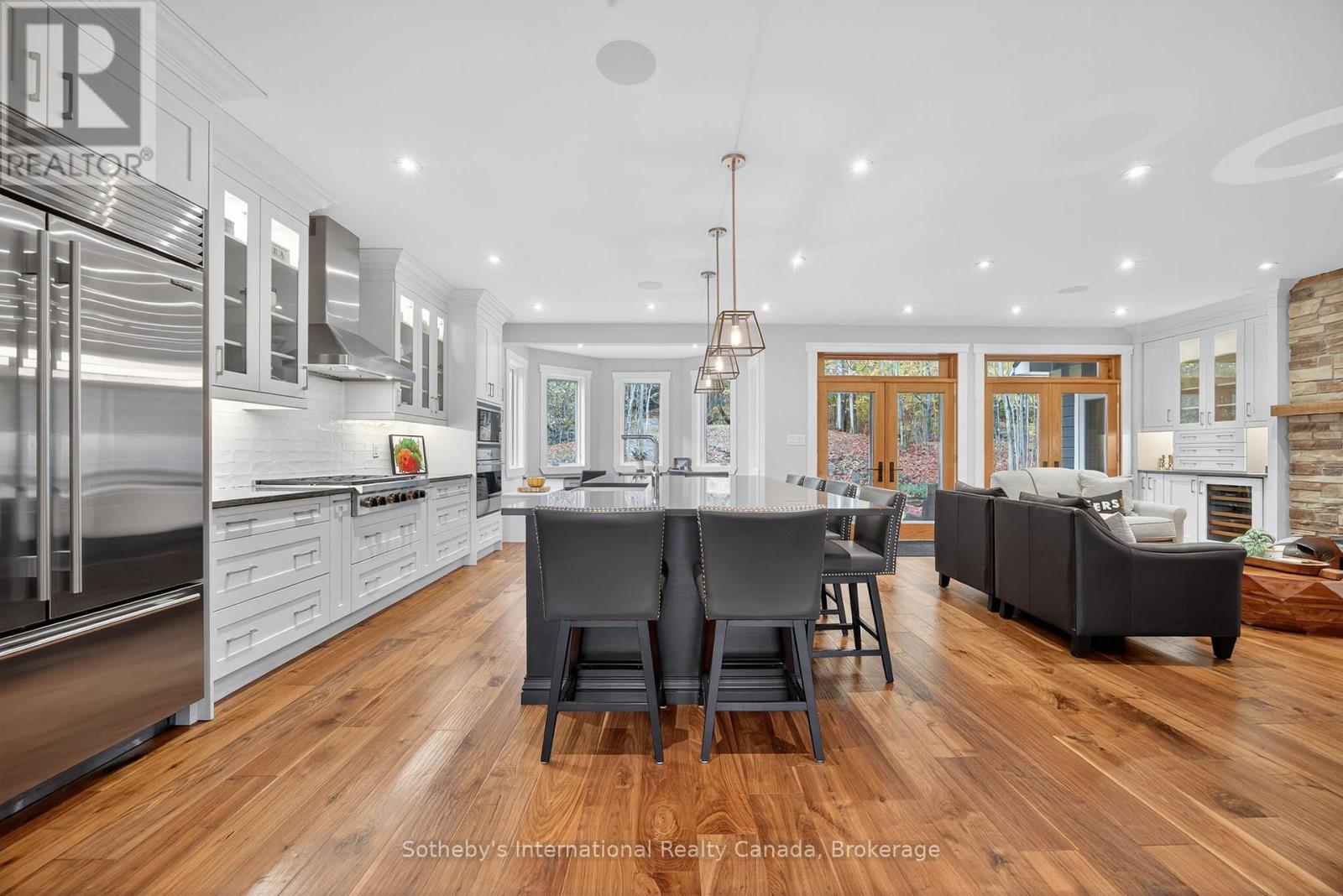 5500+ sq ft Luxury Mountain Retreat at the Base of Craigleith & Alpine Ski Clubs. Experience four-season resort living at its finest in one of Ontario's most prestigious ski community locations - a rare property where you can walk to the slopes or ski right from your door. Nestled on a private wooded lot with a soothing creek, fire pit, putting green, and picturesque bridge path, this residence offers the perfect balance of natural beauty and refined luxury.Boasting views of the ski hills and Georgian Bay, this fully renovated (2016) home features soaring ceilings, expansive windows, and three fireplaces-including a floor to ceiling stone gas fireplace in the great room, a cozy wood-burning fireplace in the upper living area, and additional gas fireplace in the family room creating a relaxing ambiance in multiple areas . The gourmet kitchen is a chef's dream, featuring high-end appliances, an oversized island with seating for eight. The open-concept dining area, framed by expansive bay views, comfortably seats ten, beer taps & multiple wine/beverage fridges-perfect for hosting apr\u00c3\u00a8s-ski dinners and family gatherings. Home includes a games room, gym, and lower-level walkout. After a day on the slopes, enter through the grand mudroom with custom cabinetry and heated floors, offering seamless comfort and function. Main floor primary suite opens directly to the back deck and features a spa-like ensuite with a glass shower, soaker tub, and dual sinks. Additional luxuries include two laundry rooms with stainless steel front-load appliances and whole-home speaker system.Outdoors, enjoy beautifully landscaped grounds with a winding, illuminated driveway, a hot tub overlooking the bay, and a basketball hoop. The steel roof adds enduring quality and peace of mind.Whether you're skiing, hiking, snowshoeing, or teeing off at nearby golf courses, this is the ultimate four-season lifestyle. Just minutes from Blue Mountain Village, Thornbury, and Collingwood's shops and bistros.