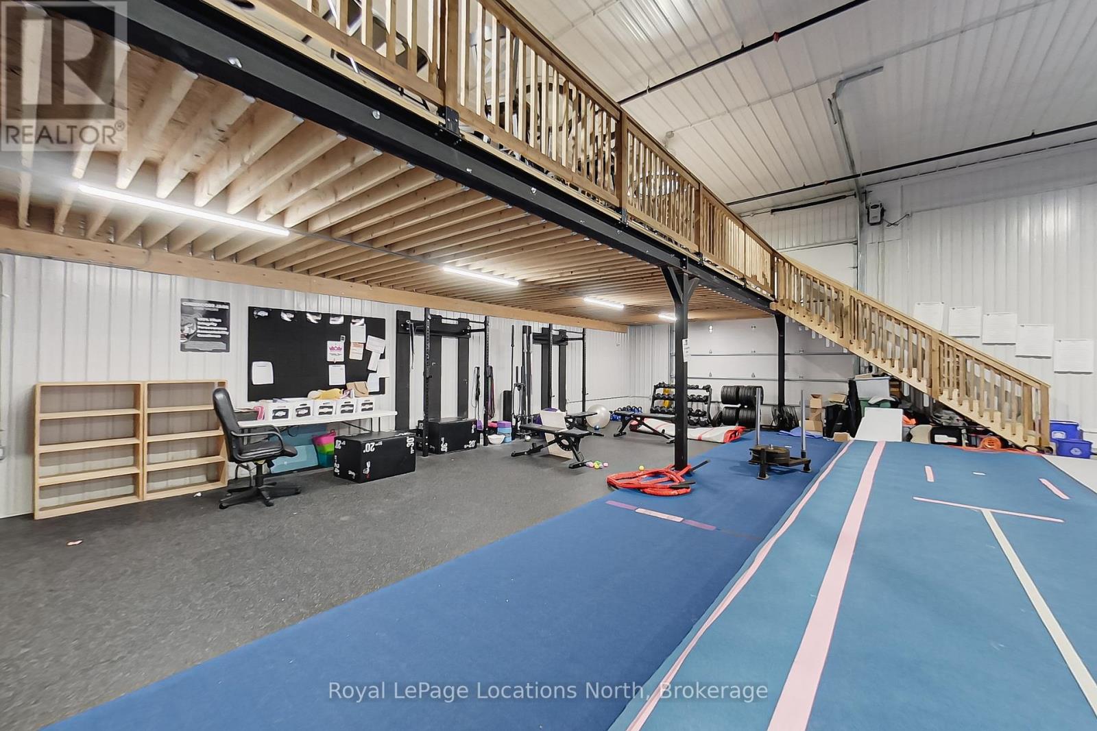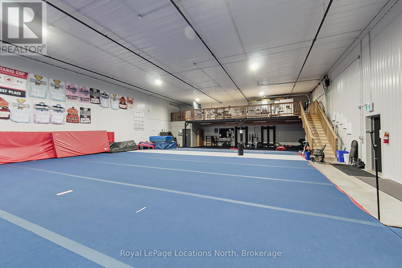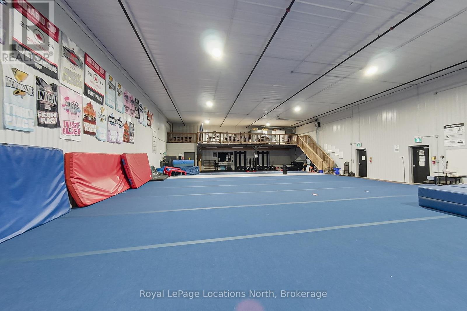 Available for lease from MILLGAR Developments, this premium industrial unit is ideally located on the highly sought-after Greco Court, just off Mountain Road in Collingwood, offering excellent accessibility and professional appeal for a wide range of permitted uses under flexible M5 zoning. The unit features 4,191.81 square feet of main-floor industrial space with 18-foot clear ceilings, two 14' x 14' drive-in bay doors, two man-door entrances, and energy-efficient in-floor heating. Currently configured as a large open-concept gymnasium, the main space remains largely untouched and ready to accommodate a variety of business visions. A functional layout supports efficient operations, while an additional 715.19 square feet @18.50 /sq ft on the second-level mezzanine offers versatile space suitable for a viewing area, office, or other business needs. Other available option is to take half the unit and Owners would build division wall.