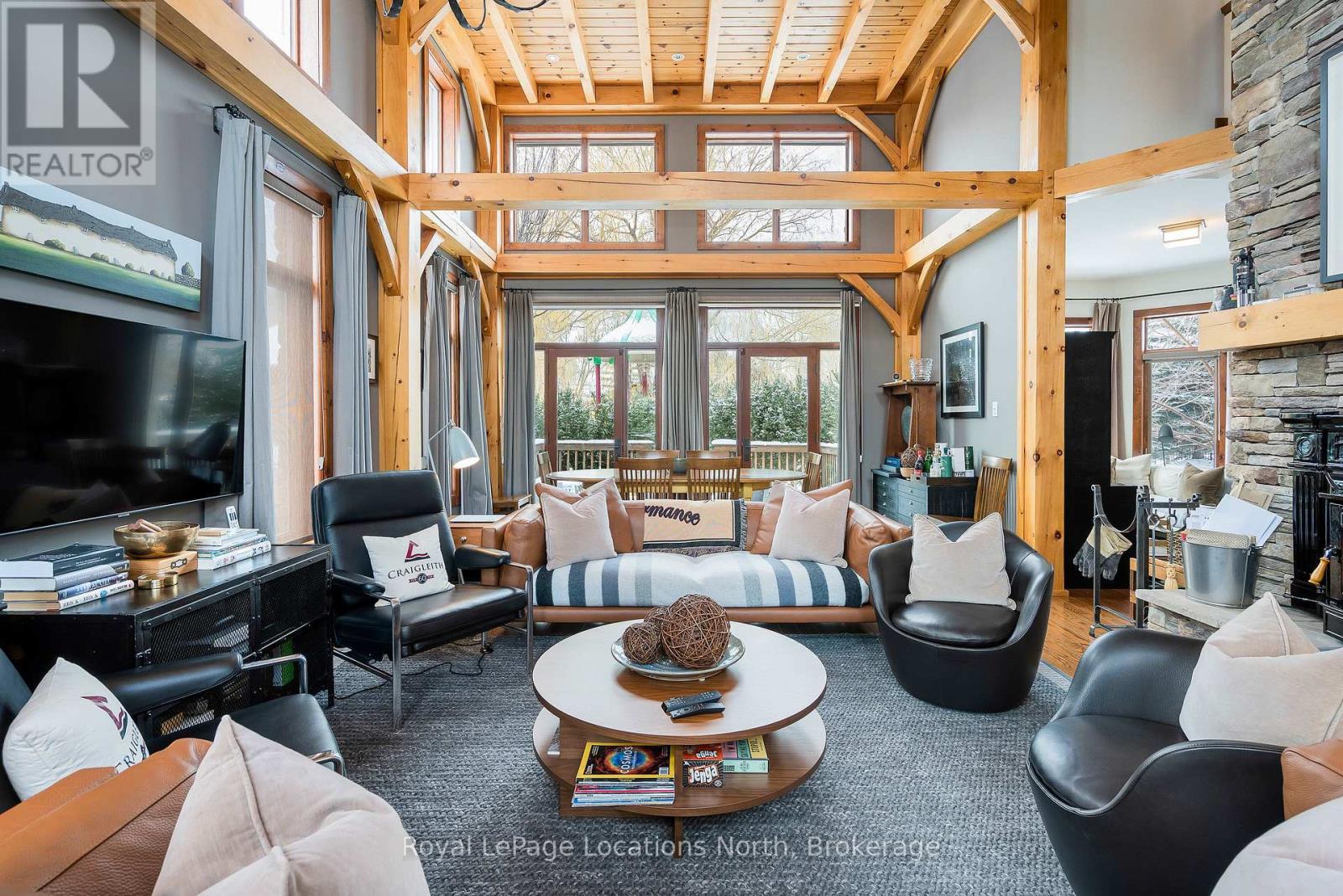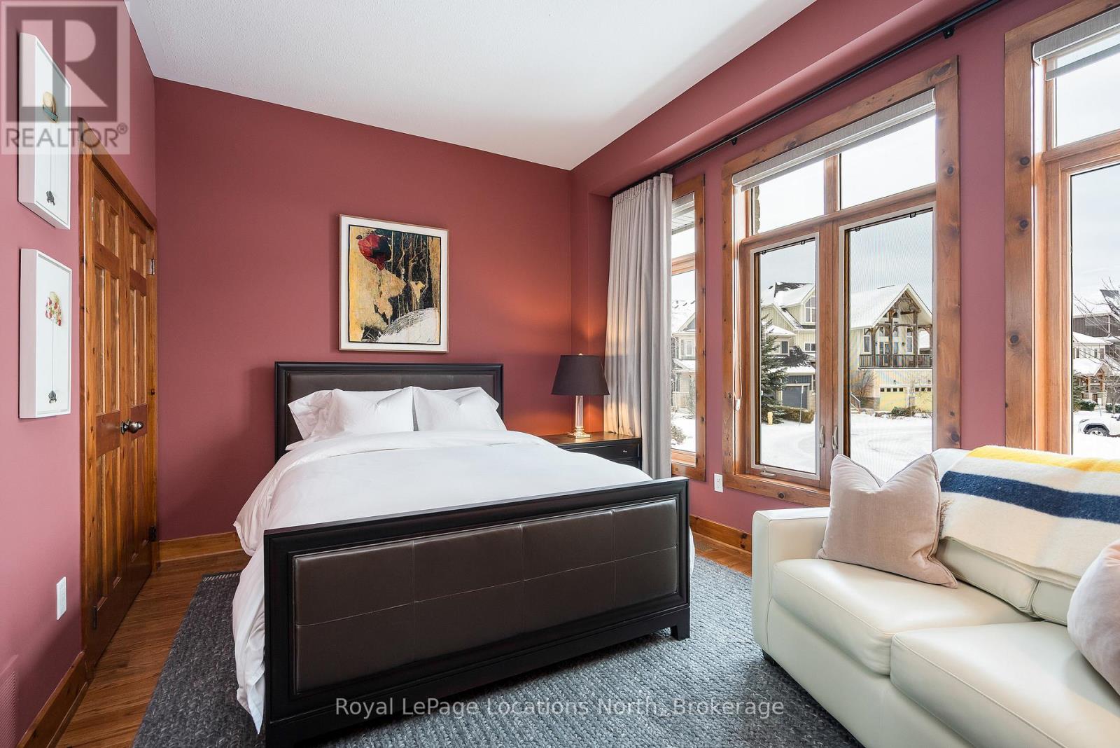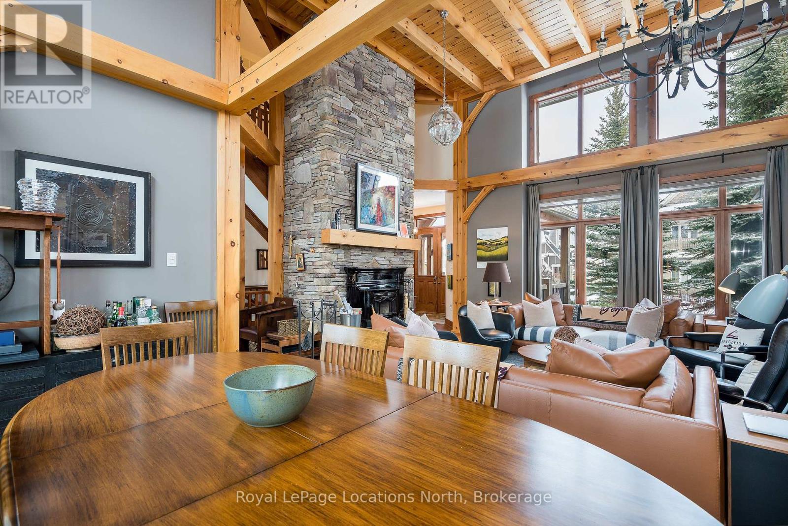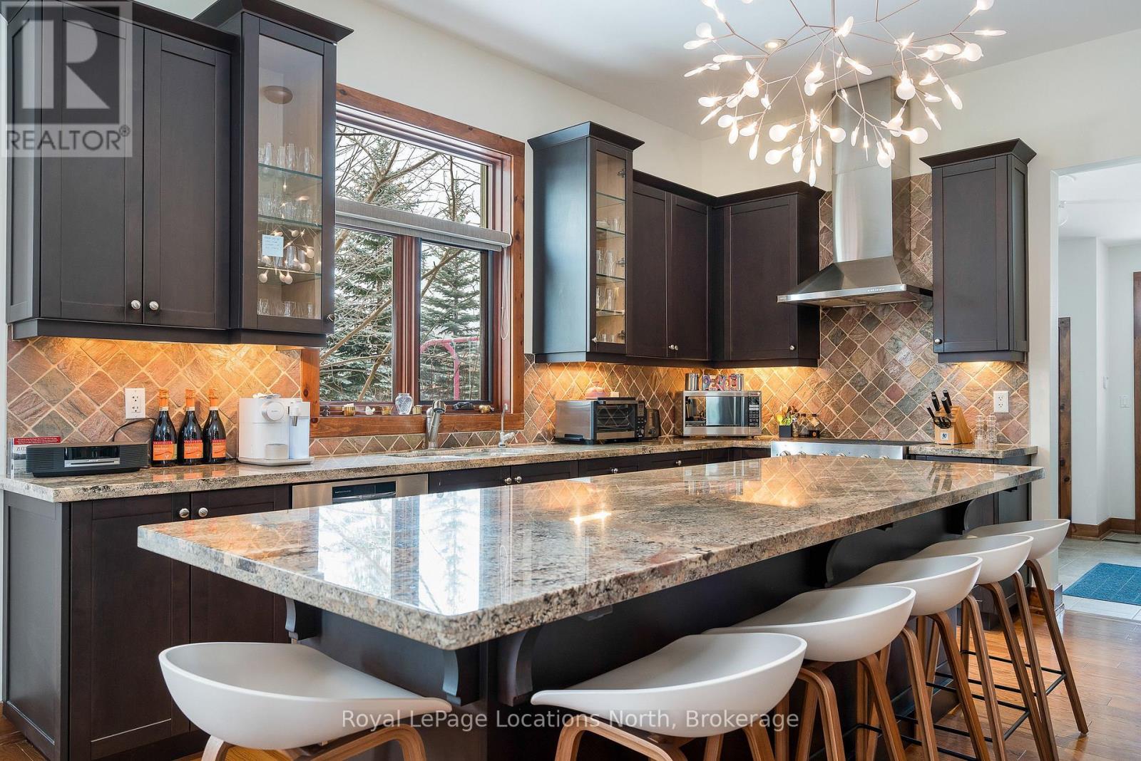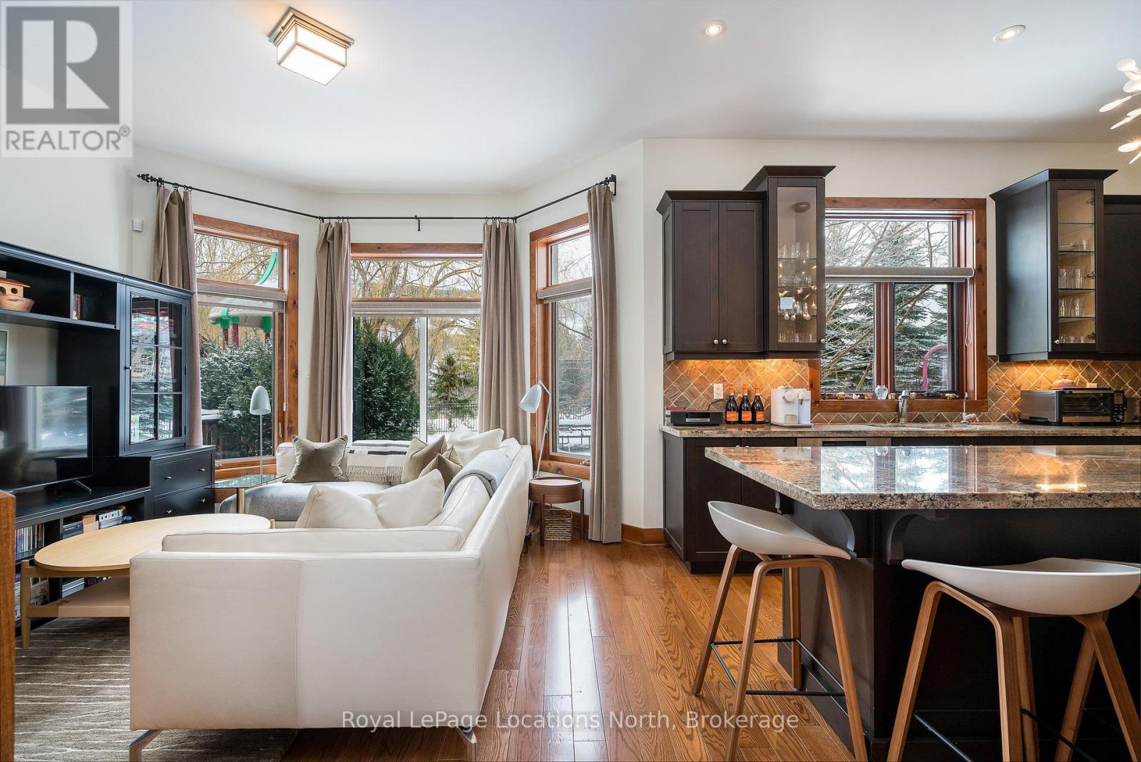 Cherished by the same family for over 15 years, this spacious 7-bedroom, 5-bath Lake Louise model in the sought-after Orchard community is ready for its next owners. Ideally located within walking distance to Craigleith Ski Club and Toronto Ski Club, and just minutes from Alpine, Blue Mountain Resort, and Northwinds Beach, this property offers exceptional four-season living. With over 4,000 sq. ft. of finished space, the home is designed for gathering and relaxation. The dramatic great room features a double-height ceiling, hardwood floors, beam accents, and a stunning double-storey stone wood-burning stove with a pine mantel. The main floor includes a guest bedroom, a 3-piece bathroom with a steam shower, a large kitchen with granite counters, gas range, island, walk-in pantry, and buffet/serving area, plus a cozy sitting area. The mudroom serves as main-floor laundry and opens to a covered BBQ porch.Upstairs you'll find four generous bedrooms and three full bathrooms, including a primary suite with a walk-in closet and ensuite featuring a soaker tub and glass shower. One guest room includes a private ensuite, another offers a balcony, and a full bath plus walk-in linen closet complete this level. Seasonal ski-hill views can be enjoyed in winter, with lush privacy in summer. The fully finished lower level adds two more bedrooms, a bathroom, sauna, two recreation areas, and excellent storage for gear.Outside, the premium lot backs onto Craigleith Ski Club and features mature landscaping, apple trees, a play set and swings, and a gate leading to a walking path directly to the club. A double-car garage with EV charger completes this exceptional offering. A rare opportunity in an unmatched location.