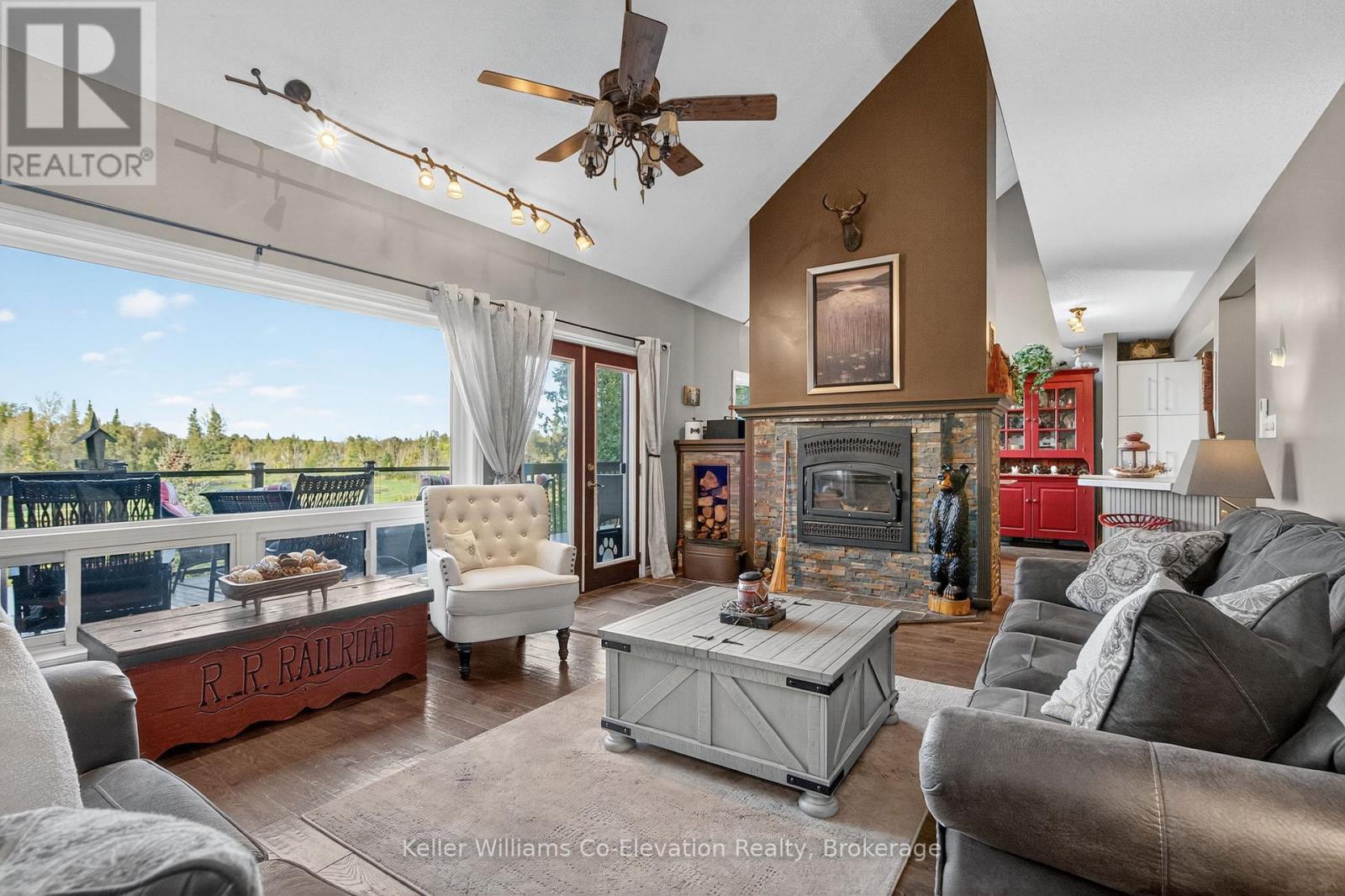 The "Westwind" Retreat is a one of a kind county estate tucked away on almost 16 acres of natural beauty. Completely out of sight from the main road, discover this serene property with it's beautiful 5 bedroom home with in-law suite, cultivated trails throughout the property, multiple outbuildings, 2 large ponds which flow into Little Beaver River, connecting to Lake Eugenia. From the moment you step onto its grounds, you are transported into a realm of enchantment and serenity that captures your imagination. This 5 bedroom chalet style home has a grand open living space, main floor primary bedroom with ensuite bath, 3 bedrooms on the upper level with 3 piece bath and a fully finished lower level with walkout and complete in-law suite featuring a separate kitchen. The home's architecture blends seamlessly with the natural surroundings. Enjoy truly spectacular sunsets off your back deck or back covered patio. Large windows offer panoramic views of the expansive ponds from every corner of the home while multiple outdoor seating areas bring you at one with nature. This property is more than just a place to live, it's a place to unwind, relax and call home. Fish from your own dock, take the kayak for a paddle and fall in love with this spectacular property. With year-round activities such as skiing at Beaver Valley/Devils Glen/Blue Mountain, snowmobiling, and golfing, this property is your gateway to Grey Highlands' all-season recreational paradise. Located just 5 minutes from Flesherton for all your day to day needs with Markdale Hospital close by, 35 minutes to Collingwood and Blue Mountain, and less than 2 hours from Toronto, this home makes for a rare getaway with endless possibilities. Discover the perfect blend of privacy, beauty, and convenience all in one property.