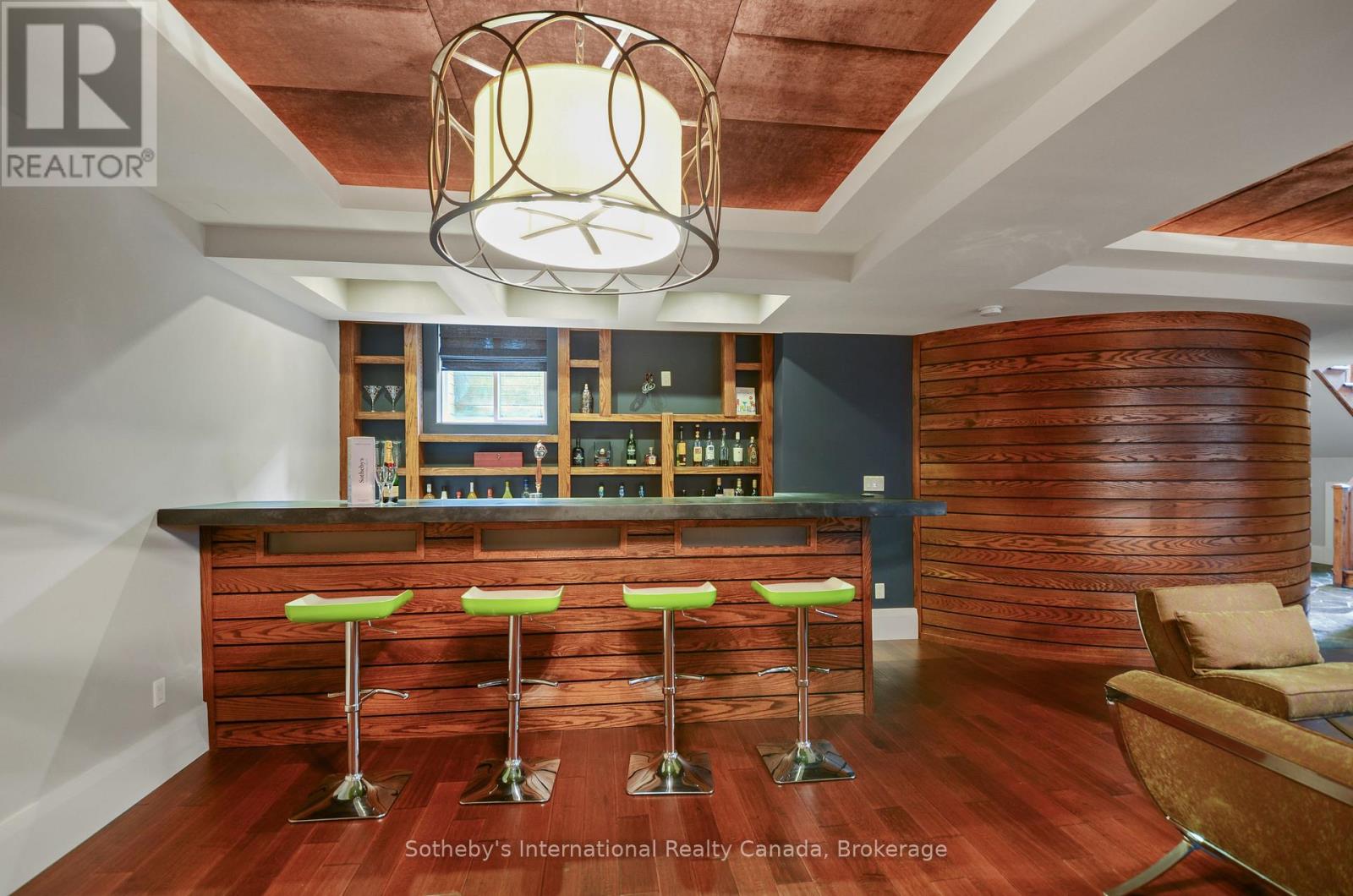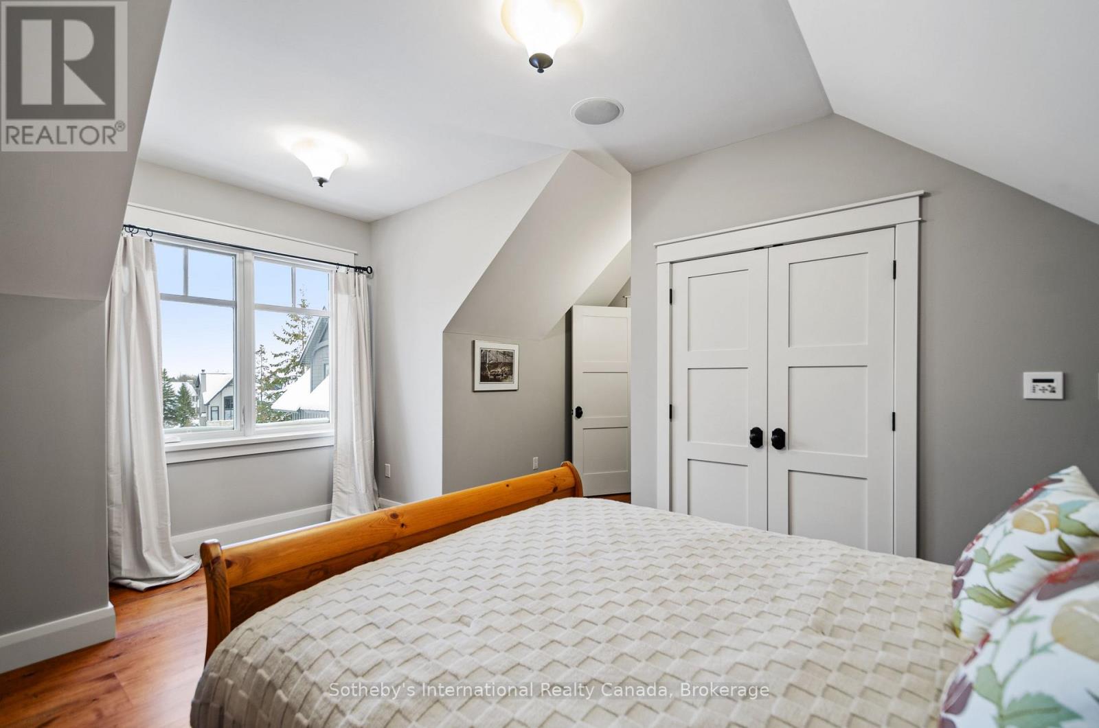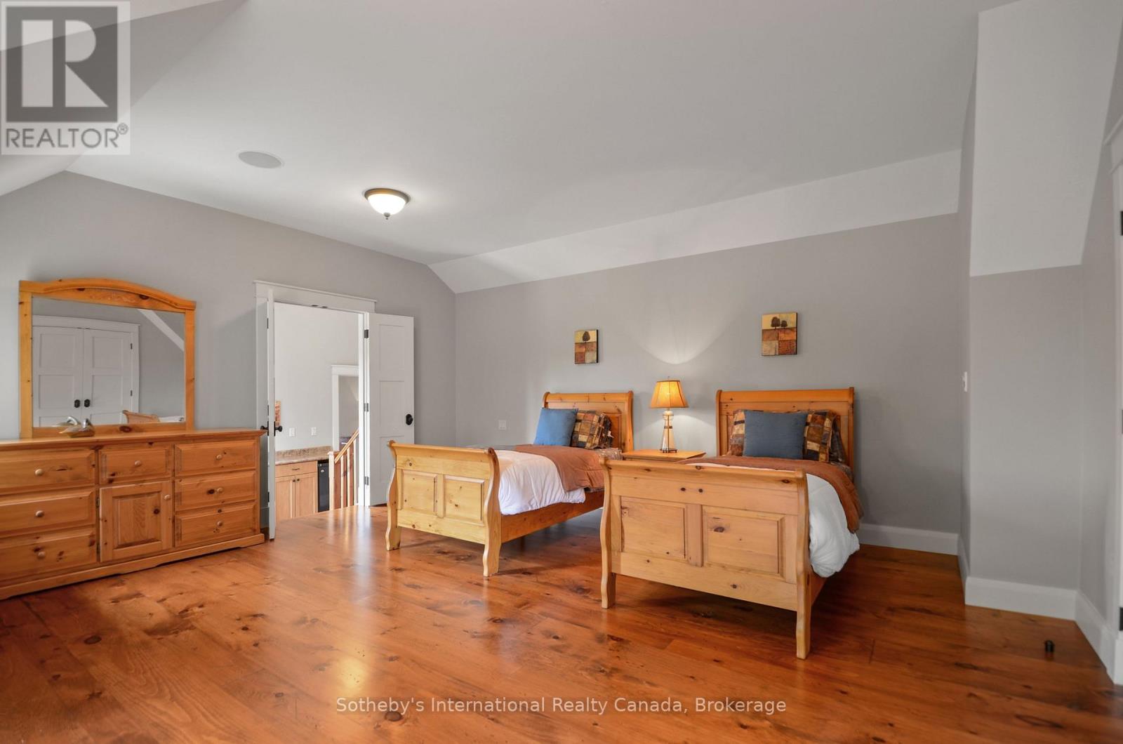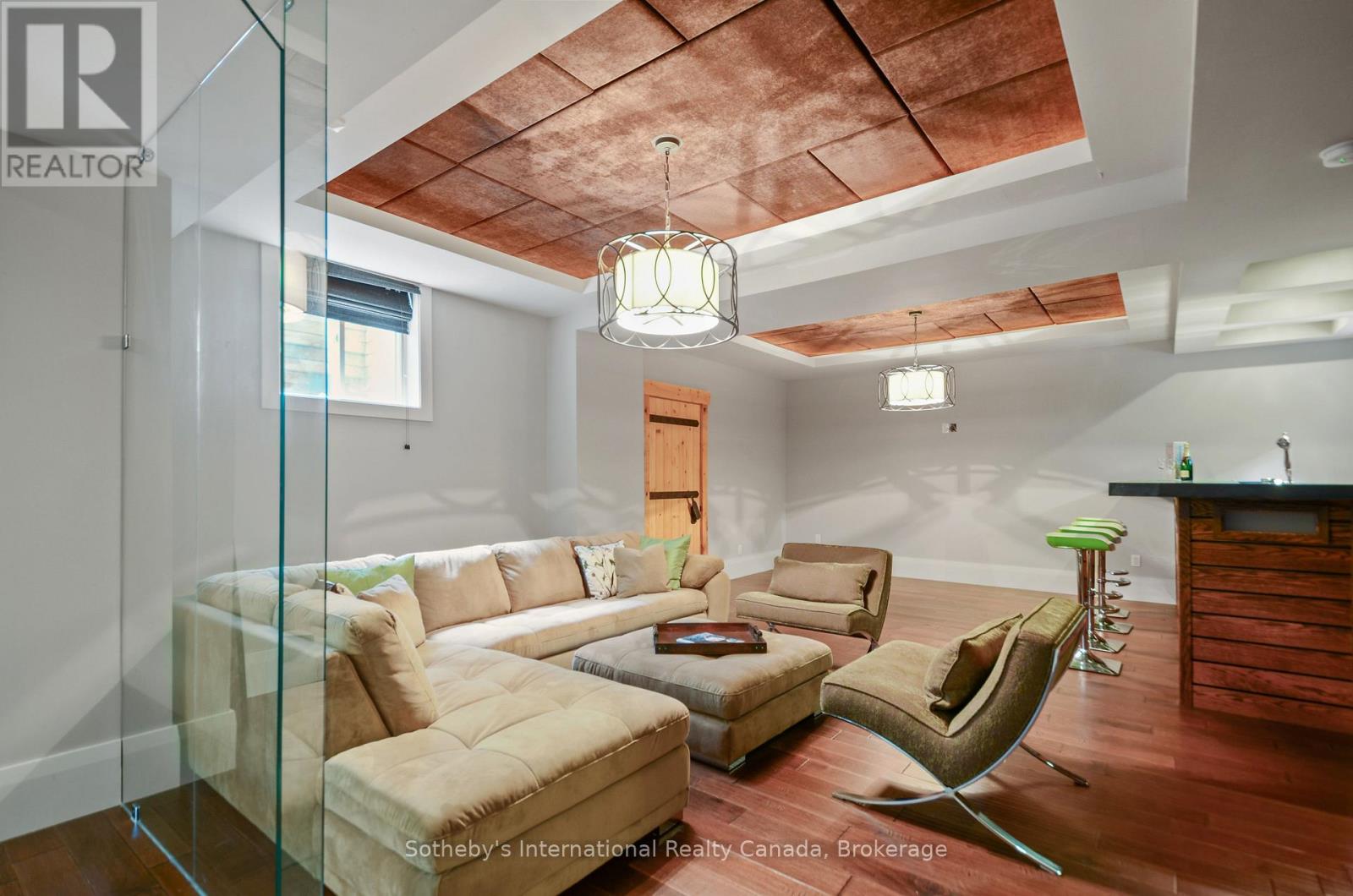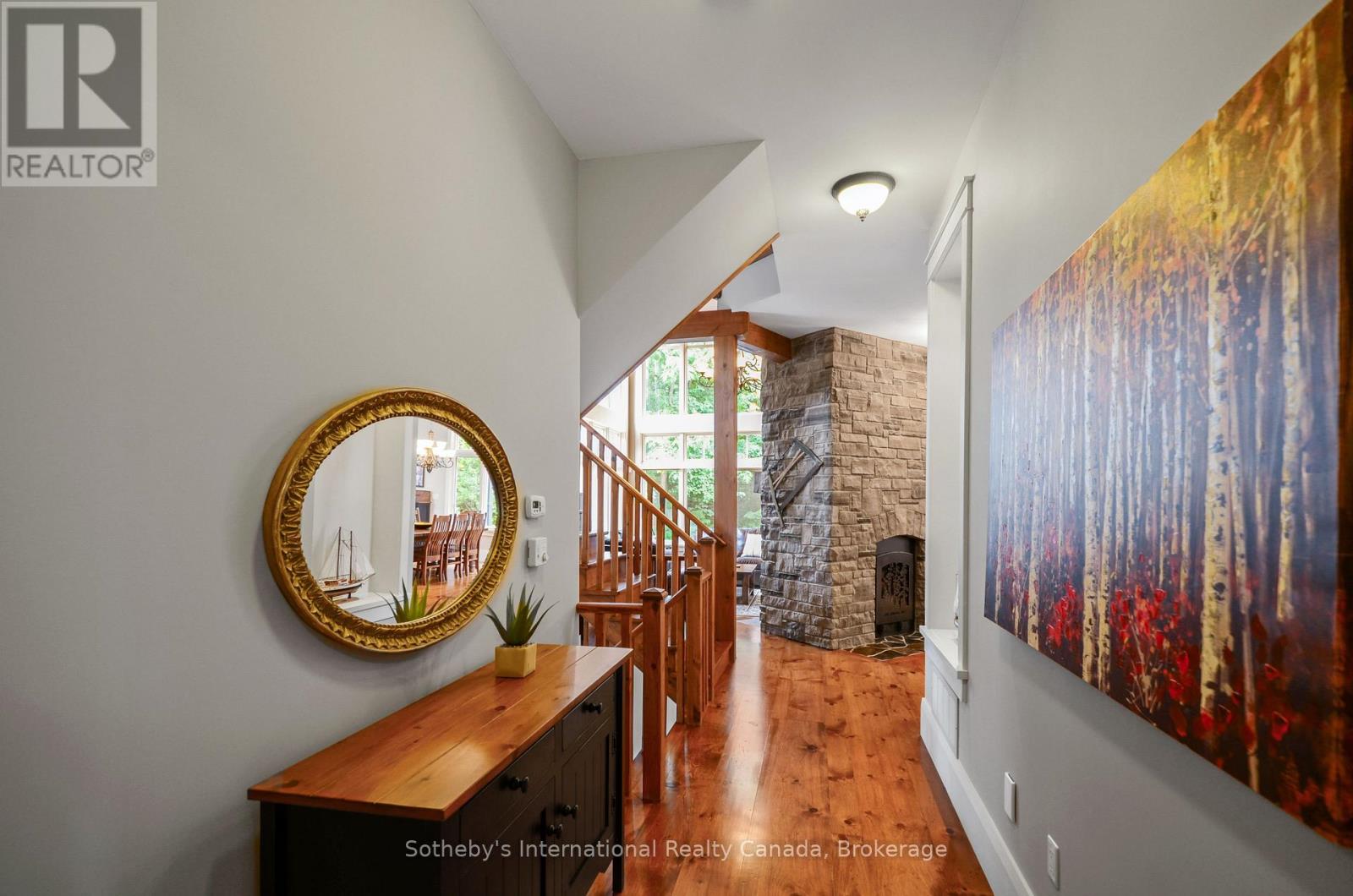 Steps to the base of Alpine Ski Club this magnificent European inspired four season Chalet is an expose of thoughtful architectural detail and high quality finishes. This impeccably designed Open Concept custom home boasts an impressive 23 ft vaulted ceilings in the great room, oversized windows, a two sided stone fireplace and chef's kitchen with walk out to outdoor dining - fireside! With ski-out/ ski-out accessibility, this premium lot and location is the ultimate recreational reprieve for family and guests. A dedicated guest suite with ensuite, kitchenette and its own dedicated entrance, and a main floor primary with ensuite, creates a spacious and expansive living space suitable for entertaining and multi generational living/entertaining. High quality wide plank pine flooring and radiant heat in all bathrooms bring warmth and luxury to this uniformly quality home.When the ski day is over enjoy the lower level that features a generous Wine Cellar, Steam Sauna, Rec Room Bar and Beer Tap, Full Home Gym and first class Media Room that seats 6 people. A double car garage with over 12 ft ceilings provides incredible space and storage. Ceiling 10ft main floor, 23ft vaulted ceiling in great room, 9ft basement, 9ft second floor with vaulted. It will be no surprise that there is an architect in the family! This is a must see.