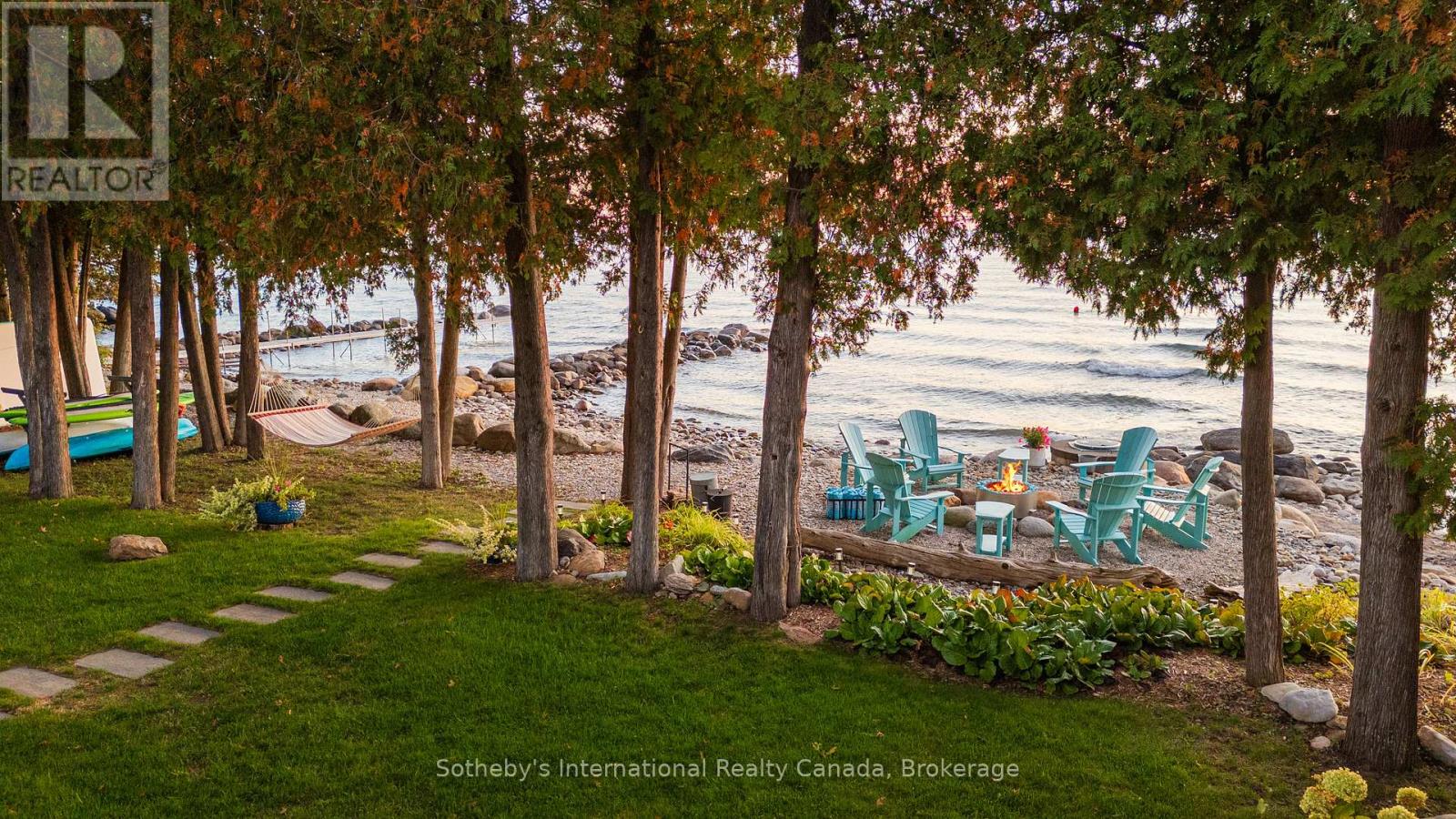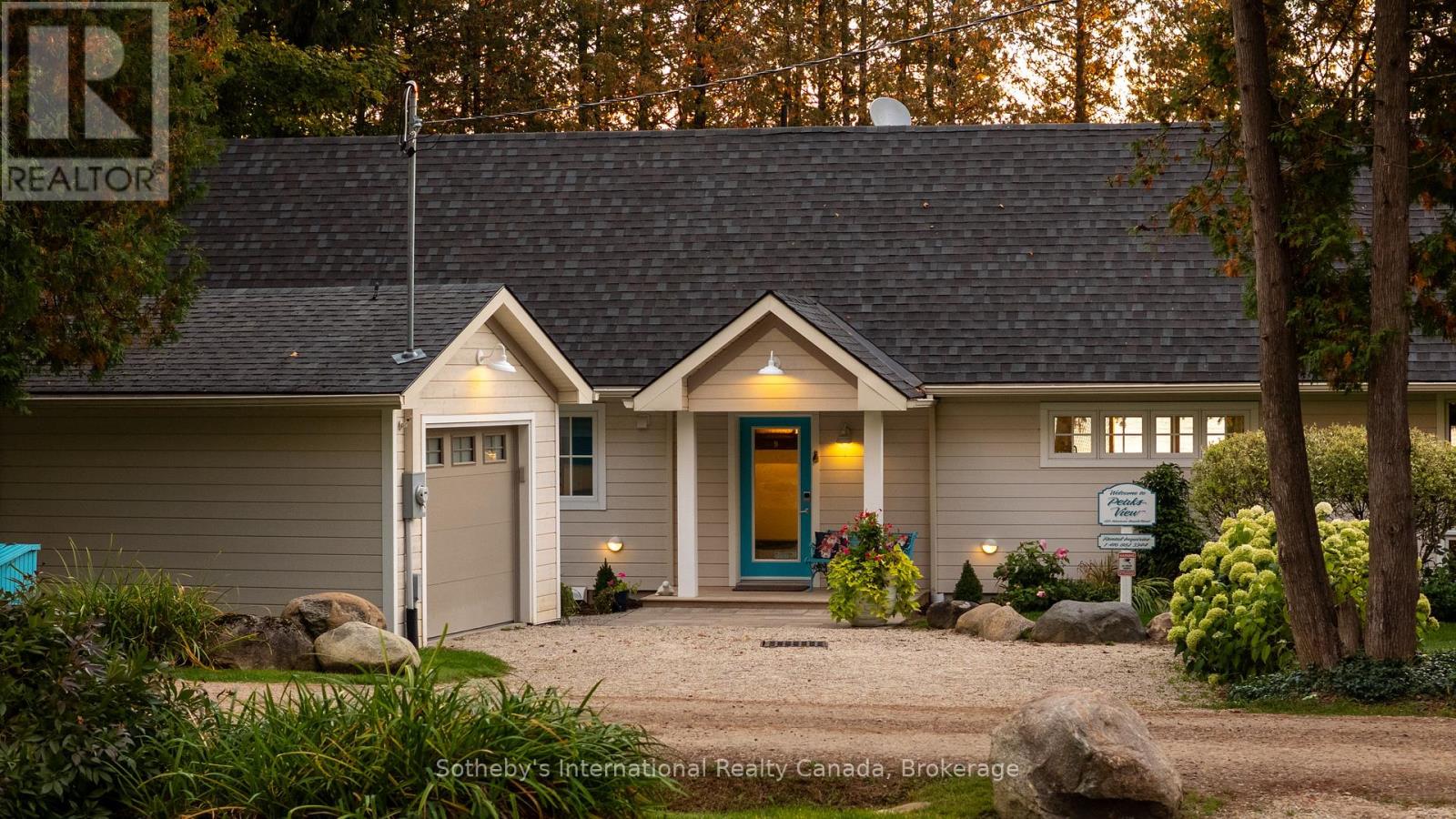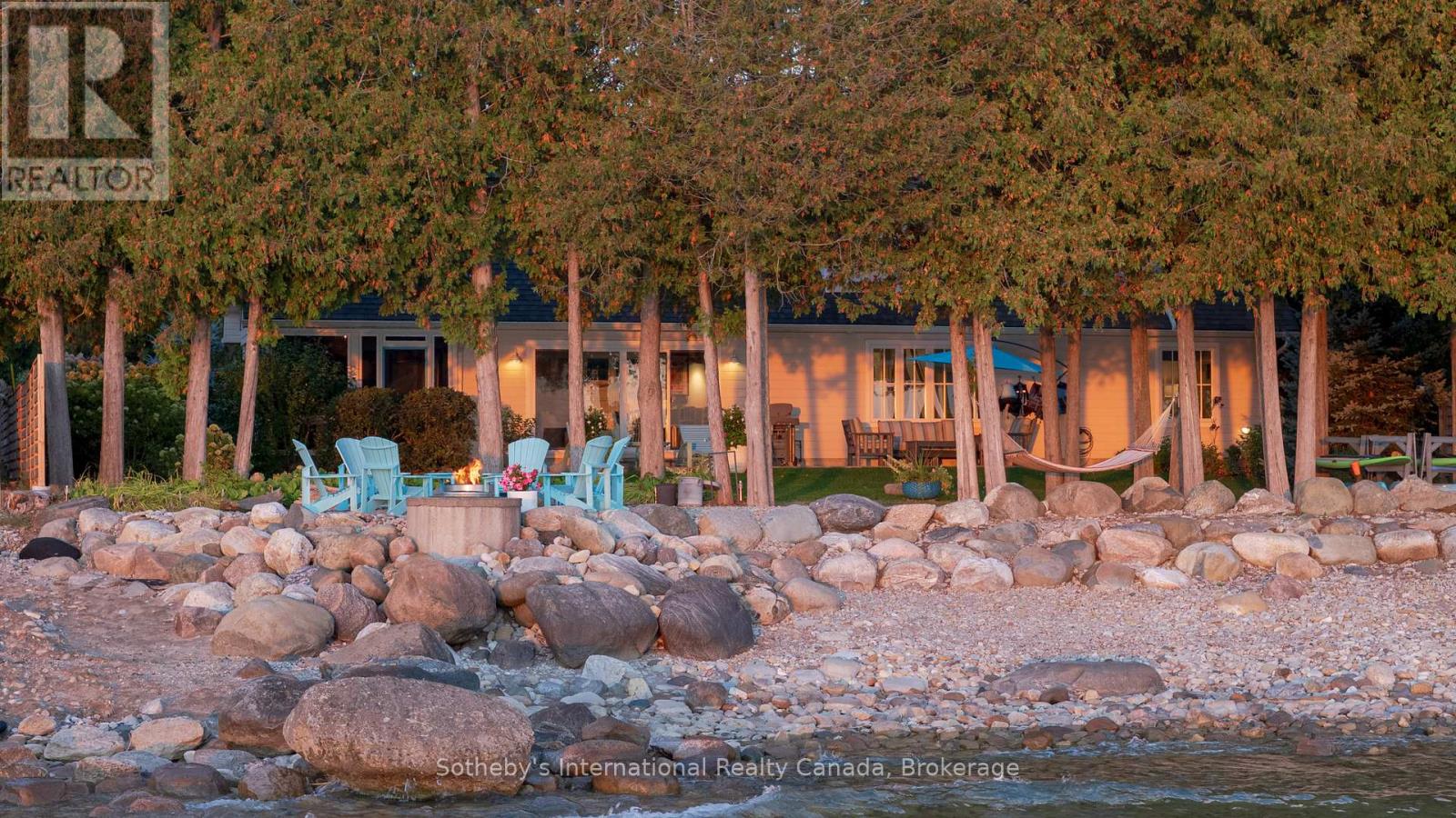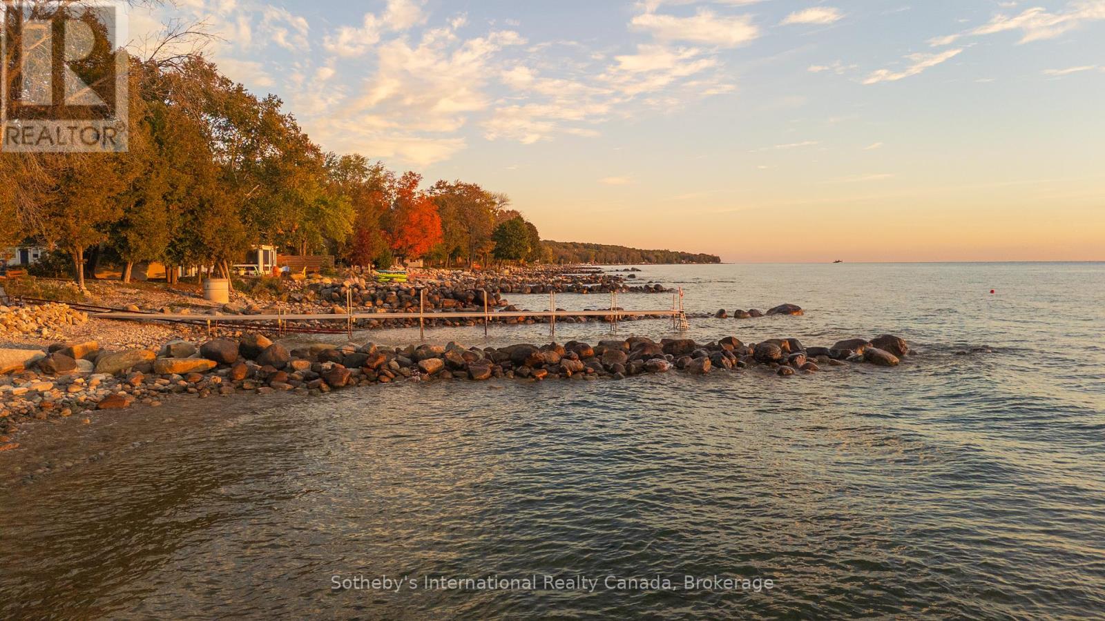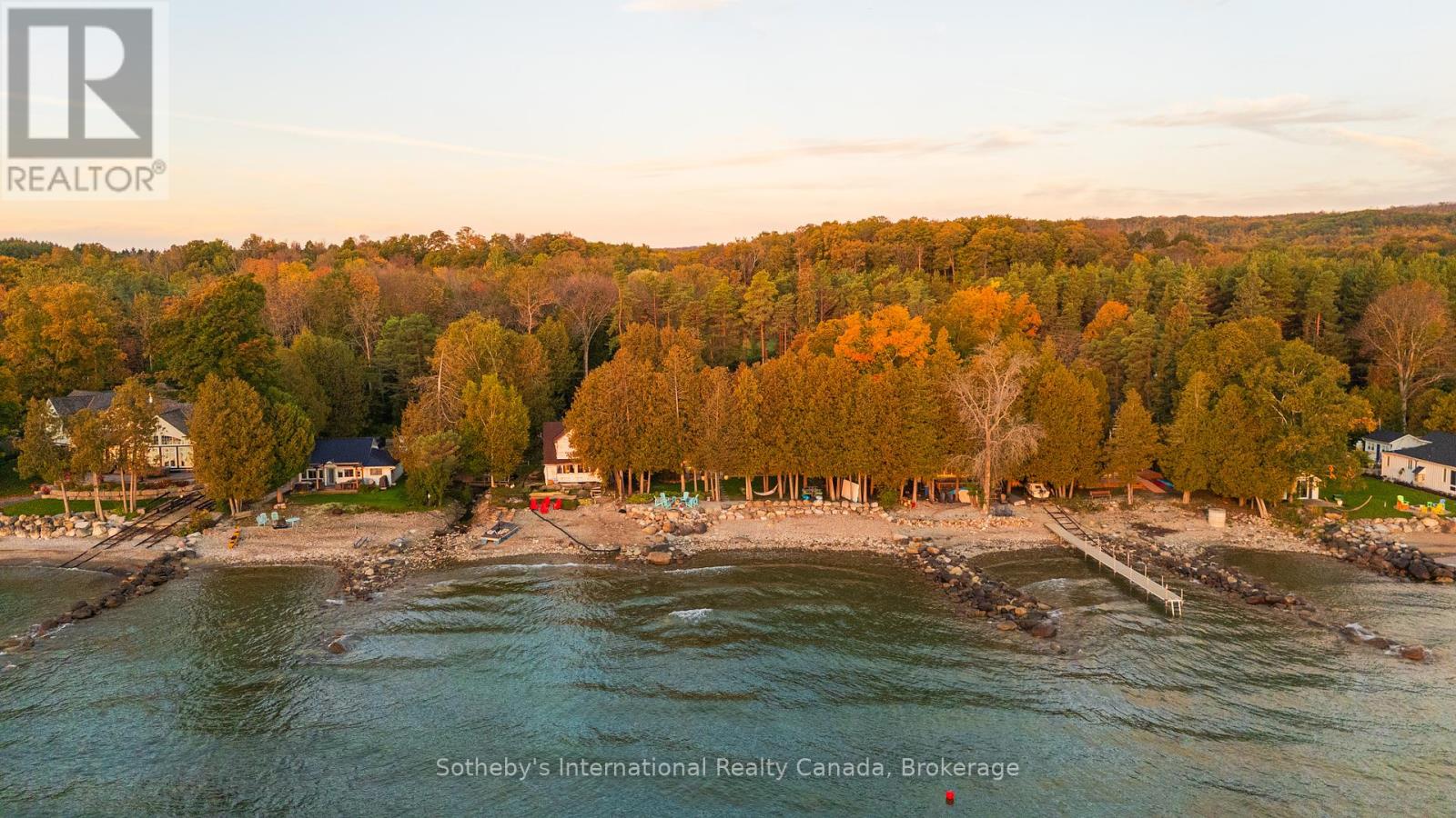 Imagine owning this rare oversized waterfront lot with 94.48 feet of private shallow shoreline on Georgian Bay.  Built new in 2017, this modern custom cottage blends clean design, quality craftsmanship, and an unbeatable location, complete with some of the best sunrises the Bay has to offer. Inside, the 3-bedroom, 2-bath layout offers 1,215 sq. ft. of beautifully finished living space. The great room features shiplap cathedral ceilings, while the kitchen includes custom face frame kitchen cabinets, quartz and stainless counters, top-end appliances, and a large island with seating for 8. The open-concept living room showcases luxury vinyl flooring, a gas (propane) fireplace, and patio doors opening to a landscaped yard with expansive water views, multiple seating areas, and a waterside firepit perfect for soaking in your Georgian Bay lifestyle. Another set of patio doors leads to the screened-in porch, a spacious dining area with heaters, creating the ideal 3-season space for al fresco meals and evening relaxation. The detached garage features a new insulated garage door with proslate wall panels to maximize storage, with the back section being converted to heated storage with shiplap walls, a heated tile  floor and an electric runtal wall panel. Additional features include a Generac generator and a heated 4' crawl space for added storage. Beyond the cottage, the property offers exciting development opportunities: build an additional bunkie or sports court on your back lot, or explore rental potential in one of the area's most desirable waterfront communities. Nothing has been missed here - new propane furnace (2025), Lifebreath HRV, Navien water heater, sump pump with alarm, full water treatment system (pressure tank, softener, UV & RO), 4 security cameras, alarm system, outdoor: hot & cold taps & BBQ gas line. Enjoy all this just 2.5 hr from GTA, short drive to Meaford, Thornbury & Owen Sound - enjoy golf, skiing, marina restaurants, boutiques, & vibrant community.