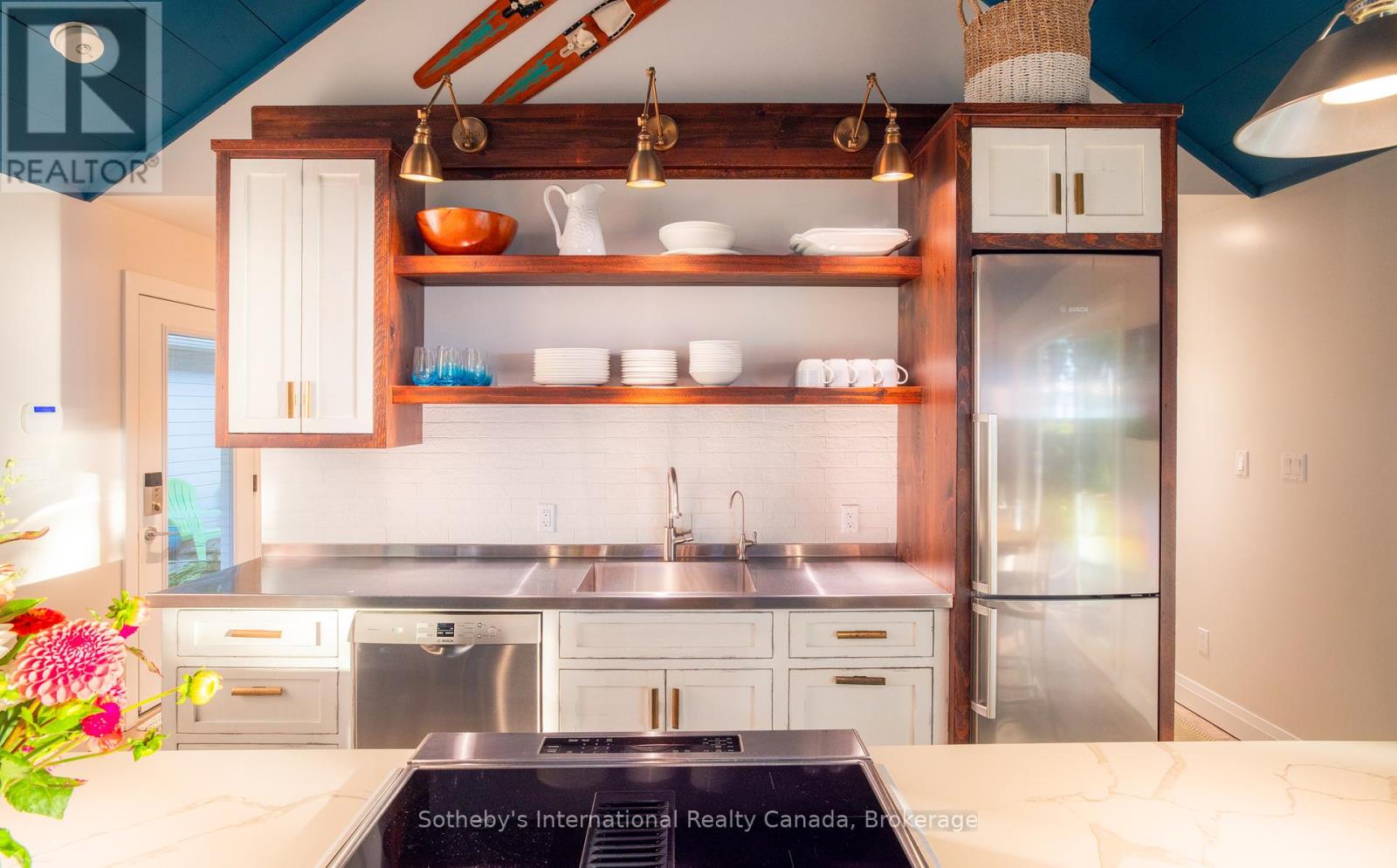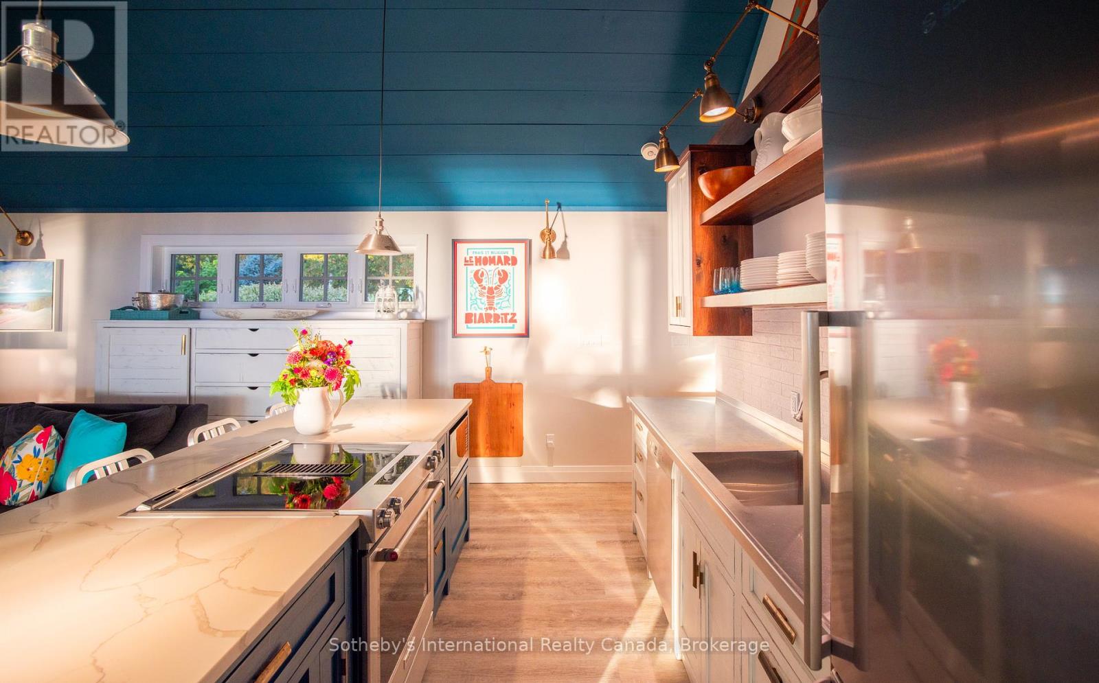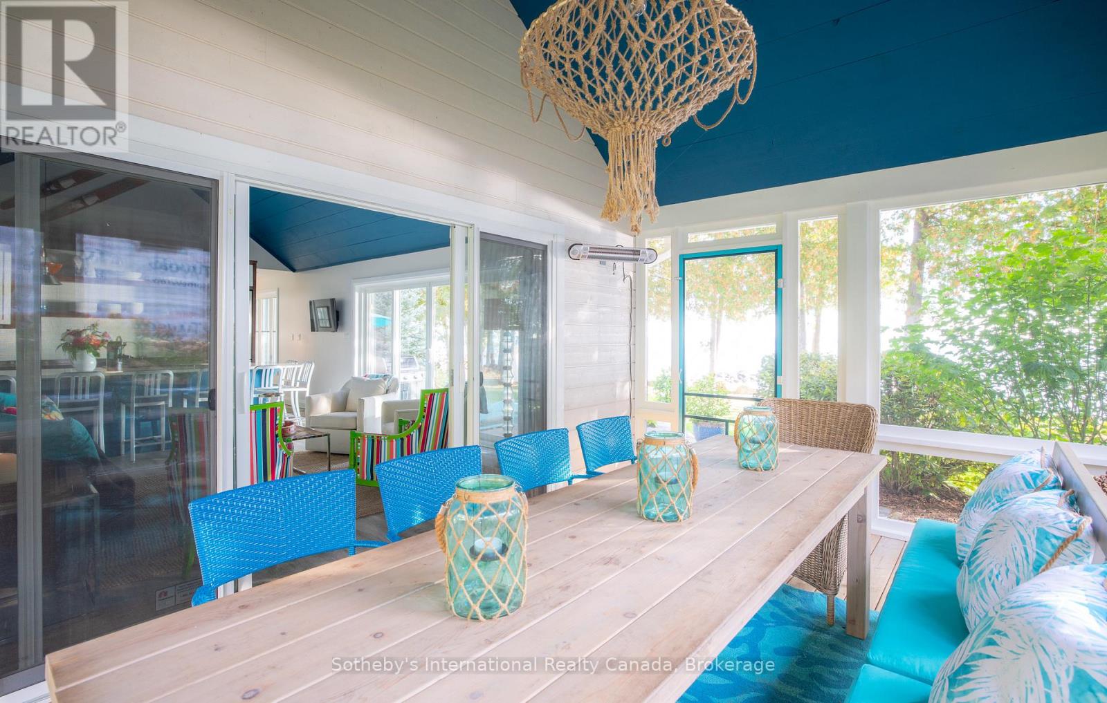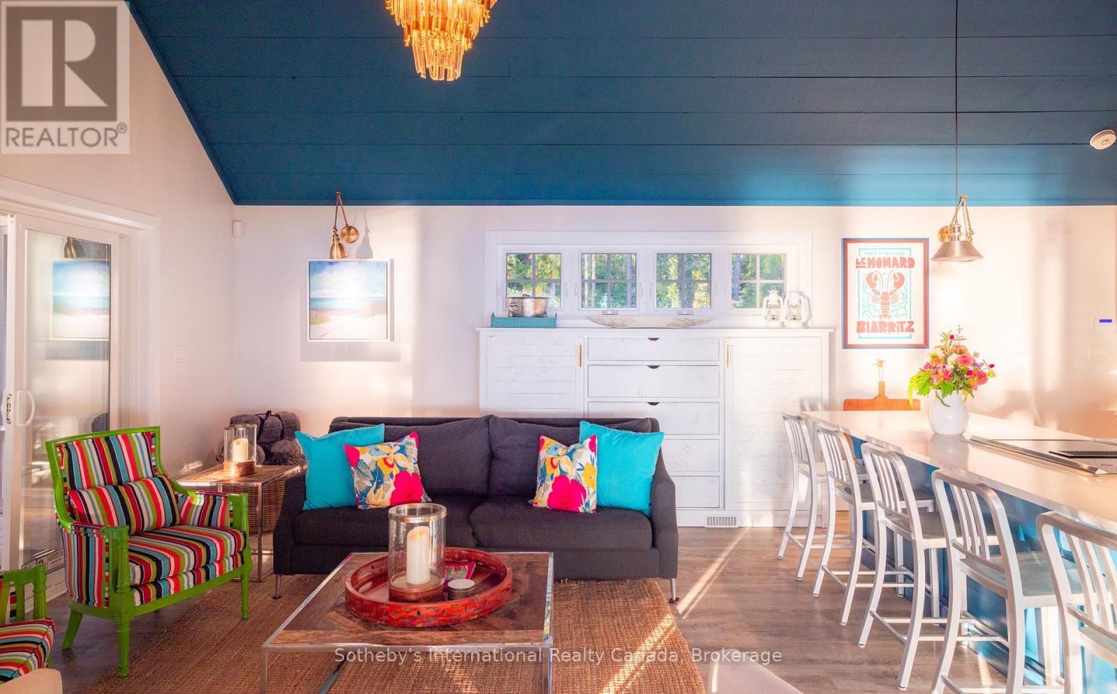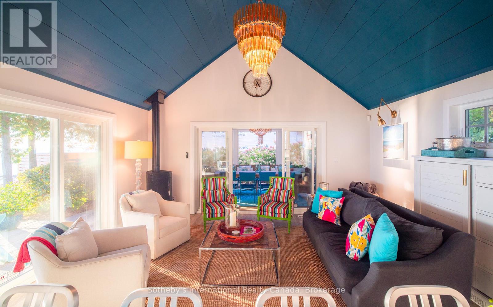 Imagine owning this rare oversized waterfront lot with 94.48 feet of private shallow shoreline on Georgian Bay.  Built new in 2017, this modern custom cottage blends clean design, quality craftsmanship, and an unbeatable location, complete with some of the best sunrises the Bay has to offer. Inside, the 3-bedroom, 2-bath layout offers 1,215 sq. ft. of beautifully finished living space. The great room features shiplap cathedral ceilings, while the kitchen includes custom face frame kitchen cabinets, quartz and stainless counters, top-end appliances, and a large island with seating for 8. The open-concept living room showcases luxury vinyl flooring, a gas (propane) fireplace, and patio doors opening to a landscaped yard with expansive water views, multiple seating areas, and a waterside firepit perfect for soaking in your Georgian Bay lifestyle. Another set of patio doors leads to the screened-in porch, a spacious dining area with heaters, creating the ideal 3-season space for al fresco meals and evening relaxation. The detached garage features a new insulated garage door with proslate wall panels to maximize storage, with the back section being converted to heated storage with shiplap walls, a heated tile  floor and an electric runtal wall panel. Additional features include a Generac generator and a heated 4' crawl space for added storage. Beyond the cottage, the property offers exciting development opportunities: build an additional bunkie or sports court on your back lot, or explore rental potential in one of the area's most desirable waterfront communities. Nothing has been missed here - new propane furnace (2025), Lifebreath HRV, Navien water heater, sump pump with alarm, full water treatment system (pressure tank, softener, UV & RO), 4 security cameras, alarm system, outdoor: hot & cold taps & BBQ gas line. Enjoy all this just 2.5 hr from GTA, short drive to Meaford, Thornbury & Owen Sound - enjoy golf, skiing, marina restaurants, boutiques, & vibrant community.