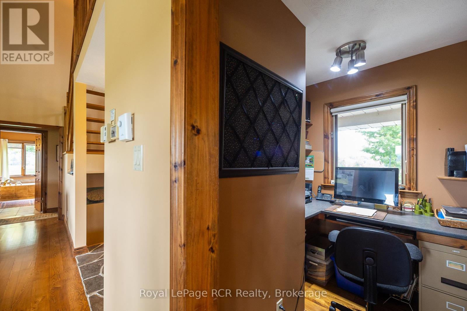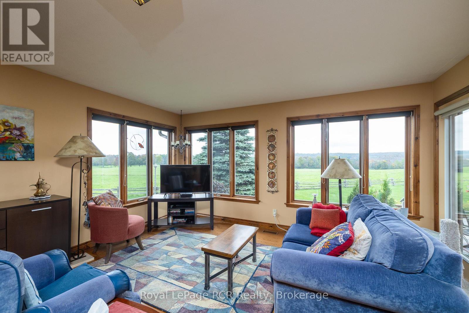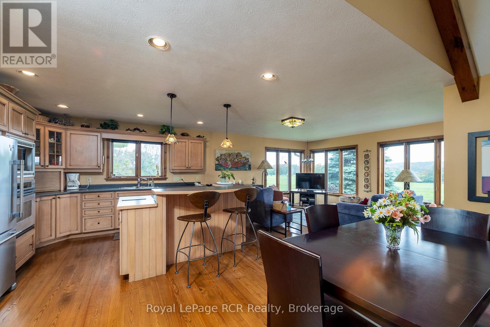 Custom home on 70 acres with commanding countryside views and the Big Head river crossing the south east corner of the property. Built in 2002, the centerpiece of the 2,200 square foot bungalow is the living room with vaulted ceilings, expansive windows and natural gas fireplace with stone surround. Lots of kitchen space with adjoining dining or sitting area. Main floor laundry with 2piece bath is just inside the entrance from the attached double garage. There are 2 spacious bedrooms on the main level and a full bathroom. There is a 13'9"x 20'2" loft perfect for overflow guests or an office. Lower level is finished with a family room (natural gas fireplace), 2 massive bedrooms and the mechanical room. This beautiful setting is so much more than the home - there are approximately 50 acres of open land that has been used as pasture, crop land and hay. Outbuildings include a bank barn, drive shed 40X60 and detached garage 20X32. Recreational activities are at your doorstep with walking trails, snowmobile trails, proximity to skiing, cultural activities and more - all within a welcoming rural community. Only 5 km to Meaford where you'll have schools, shopping and dining. 20 minutes to Owen Sound.